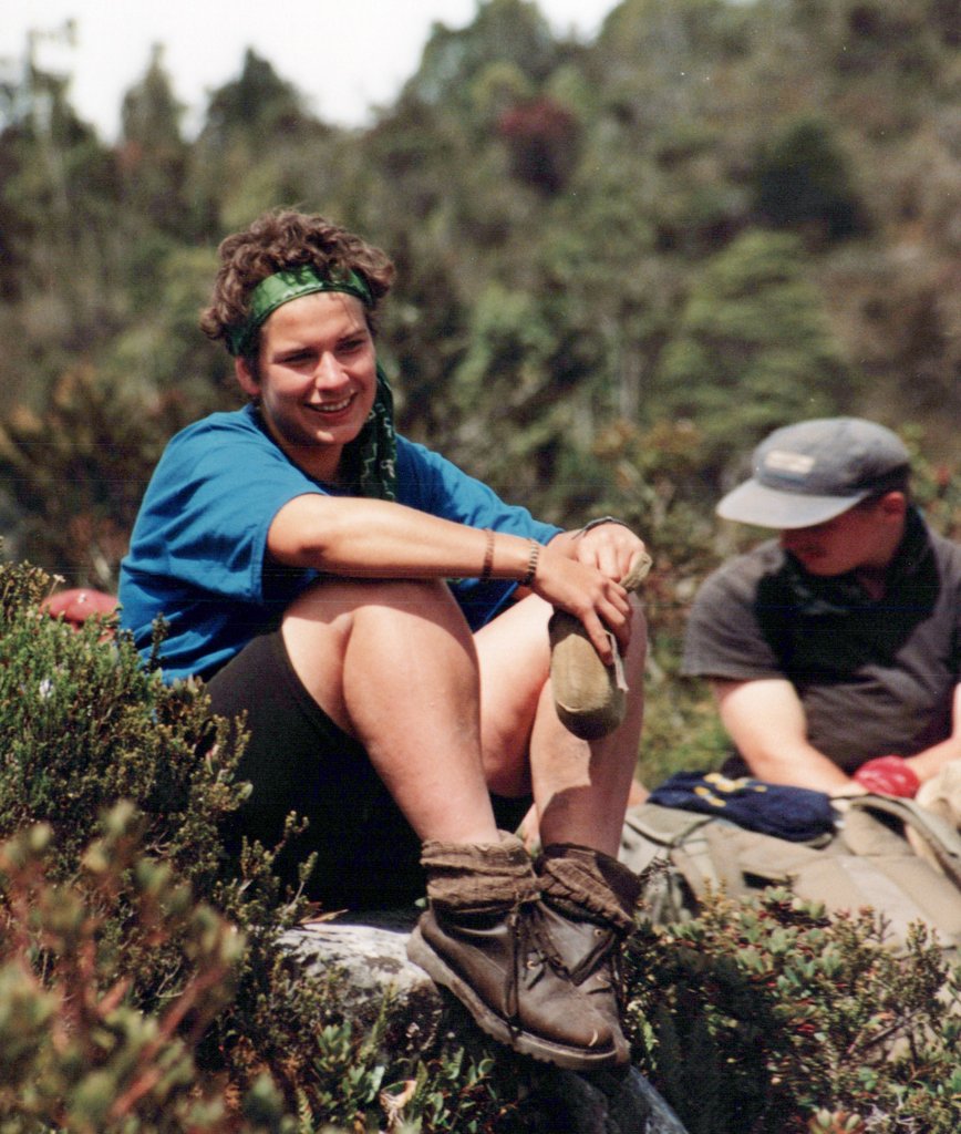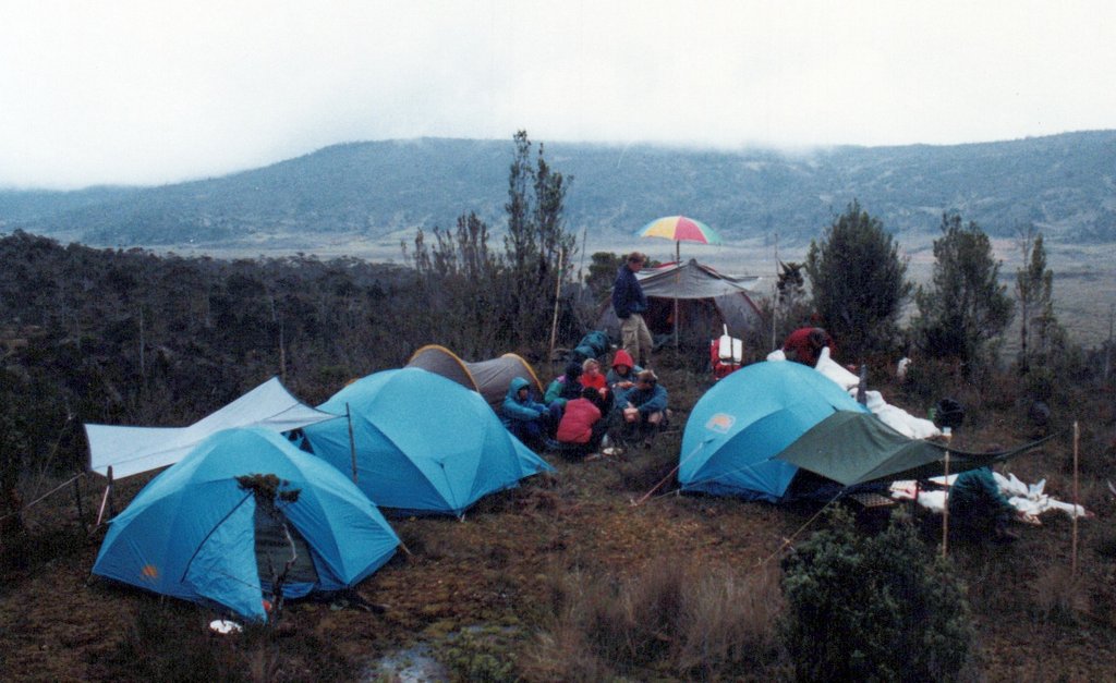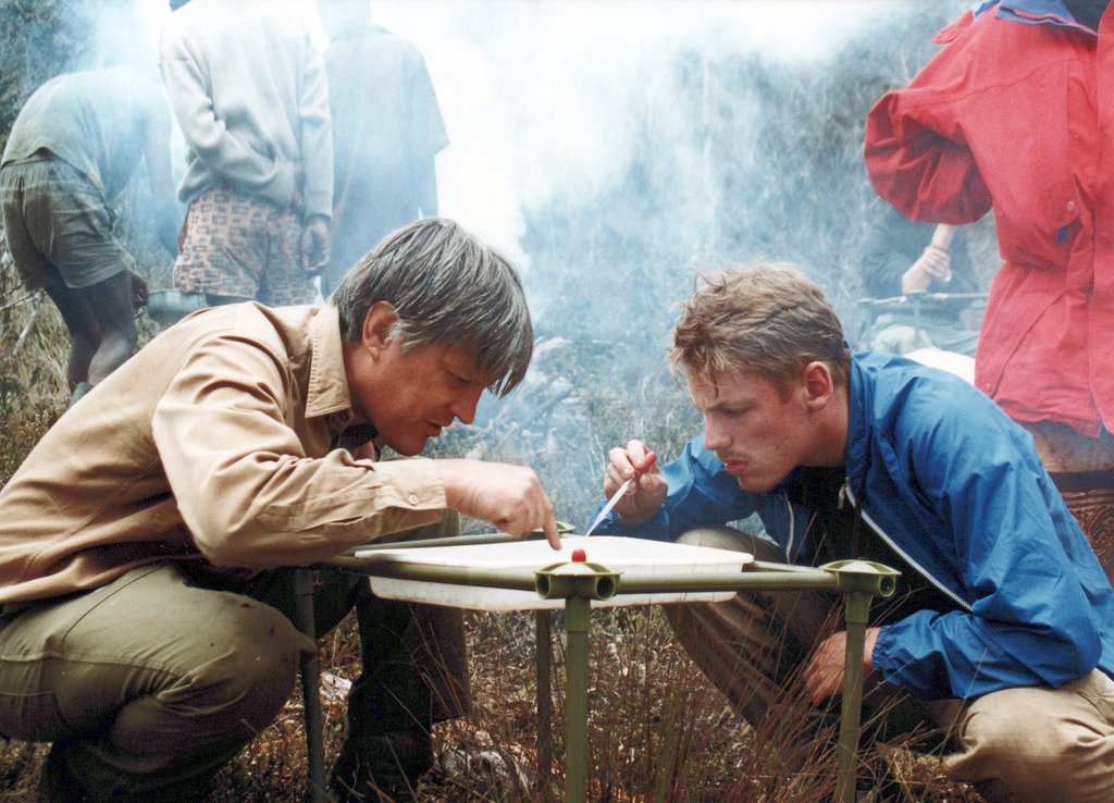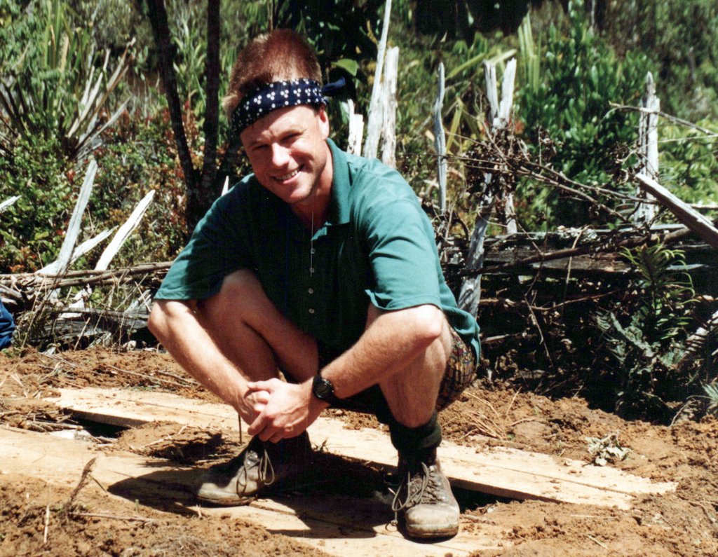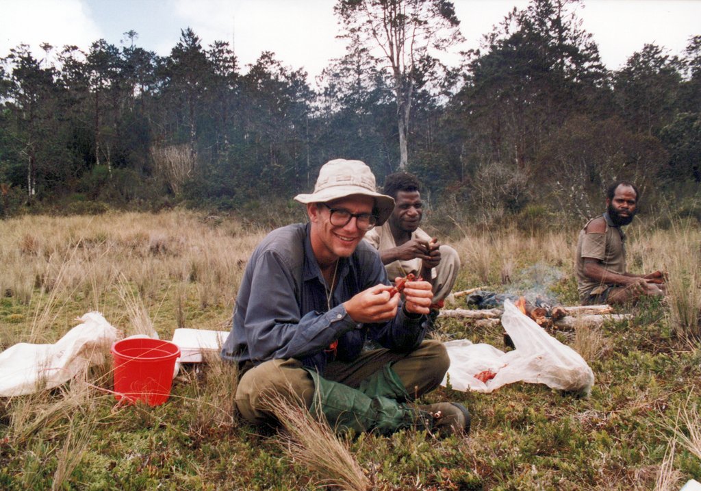 A subset of the group hiked further up into the mountains, to help with some research at Lake Habbema. On Google Maps, there is now a Lake Habbema Car Park, but it was very, very remote in 1992. One of our tasks was mapping the trail with a very early, rudimentary GPS. We discovered that a mountain was placed incorrectly on a map, so we say we moved a mountain. We set up our satellite base camp near Lake Habbema and explored around the lake when not involved in the scientific work.