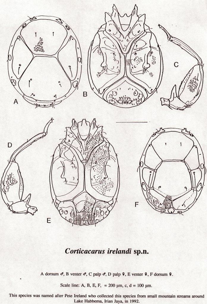 The main research that I helped with was investigating water mites with Dr Roy Wiles from the University of Buckingham. We collected water samples from the lake, identified the water mites, and then he examined them closely to identify the species. We found many new species and Dr Wiles named them after the project members. So I have a species of watermite named after me: Corticacrus irelandi. This is described in this 1997 scientific paper about the water miles of New Guinea.