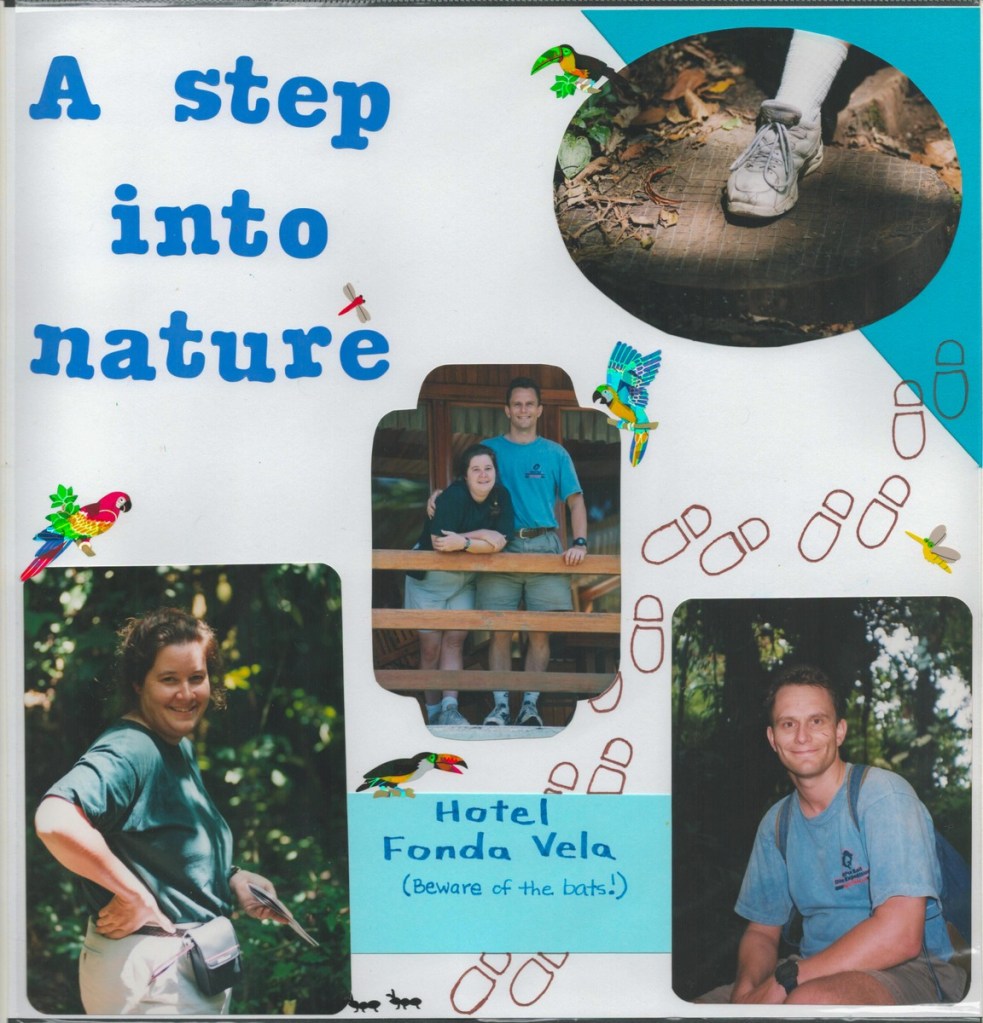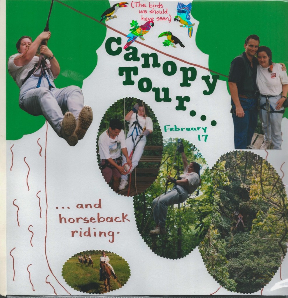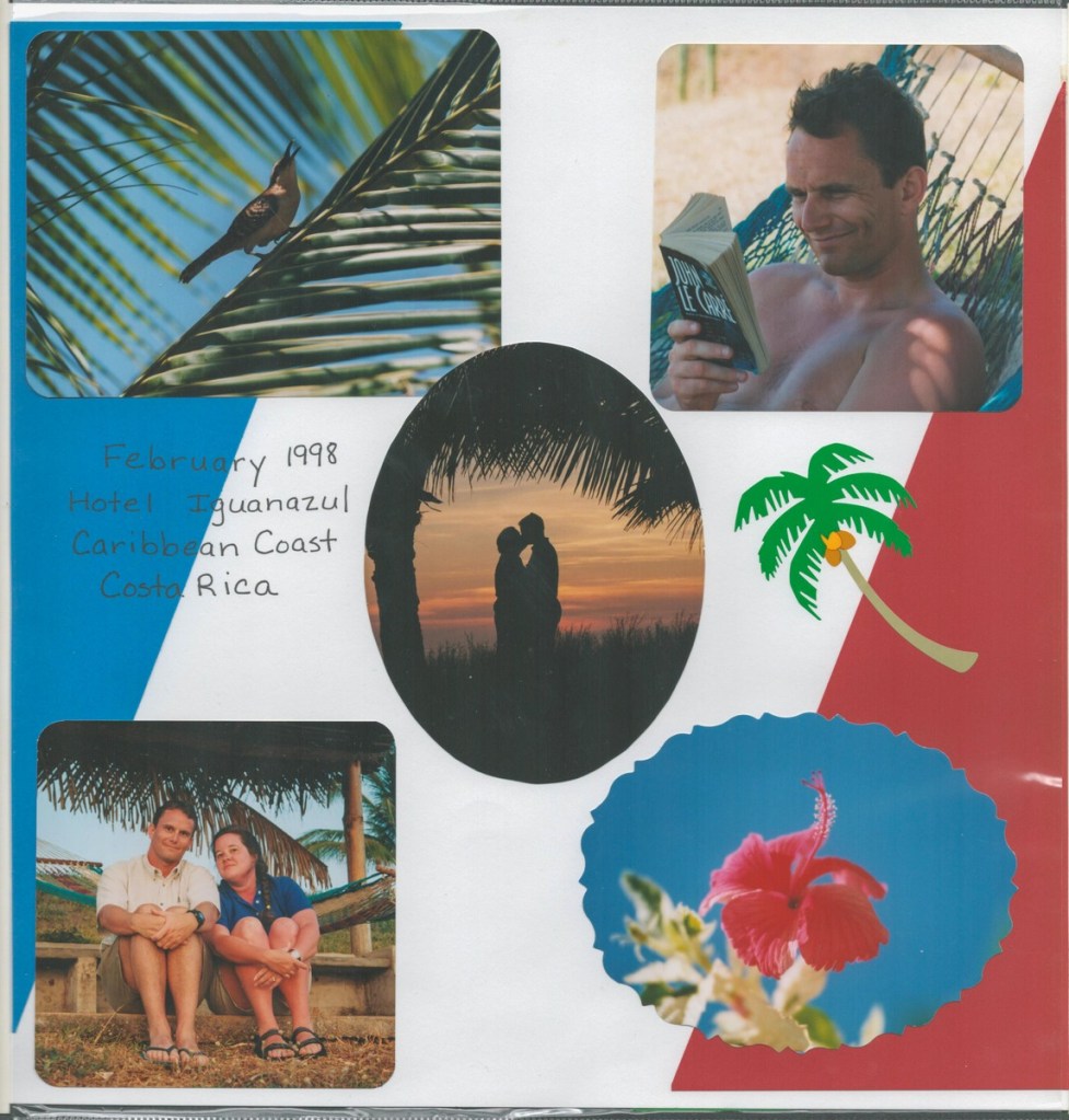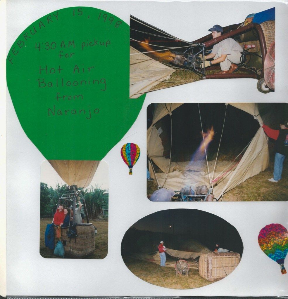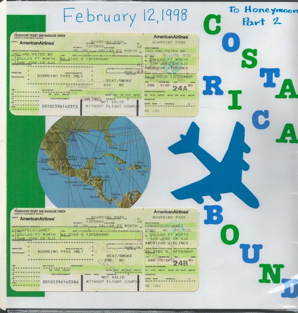 The highlight of our honeymoon was a Costa Rican adventure. We whitewater rafted, rode in a hot air balloon, visited a volcano, toured a cloud forest canopy, and chilled on a beach. Amazingly, Janet arranged all of this using a rudimentary WebTV set (using dial-up internet and a TV as a screen)! Janet produced a fine scrapbook of the trip, scans of which I share below.