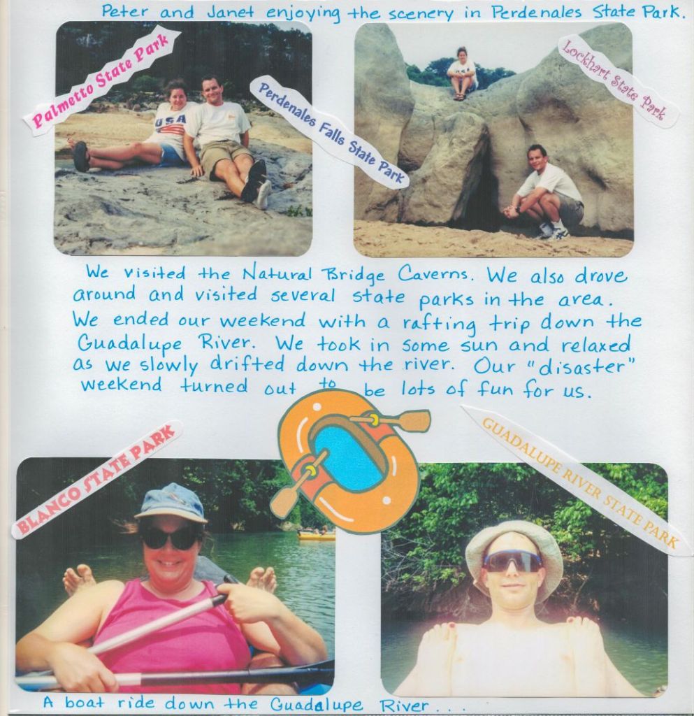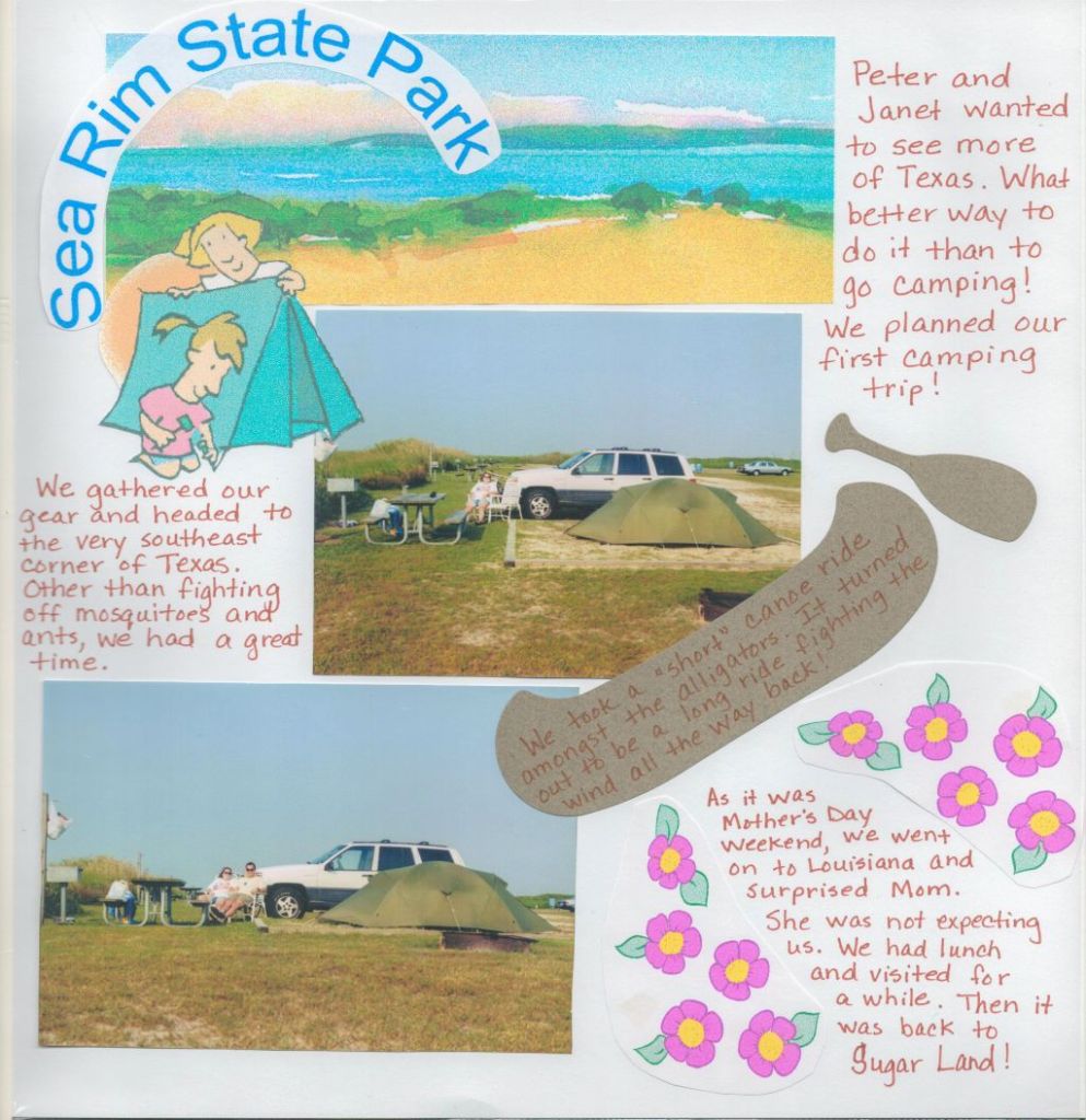 Three months after our wedding, we decided to try camping on the way to Janet’s mom from Sugar Land to Crowley, Louisiana. I am surprised Janet ever entertained the idea again! We used my backpacking tent and I have two vivid memories. First, when getting up in the morning, I remember seeing a queue of mosquitoes just outside our zipper! Second, just as we got into our rented canoe, an alligator poked his head out of the water immediately alongside. I guess it’s experiences like this that make or break a relationship! Janet was great at scrapbooking too.