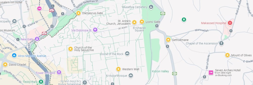 Days 5, 7, and 9 were for exploring Jerusalem and its immediate surroundings. Our fifth day was filled with exploring the route from the Mount of Olives, across the northeast corner of the Old Town, to the Damascus Gate.