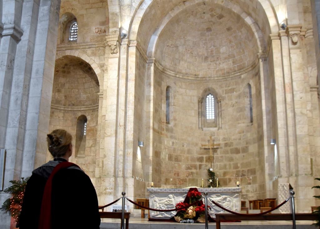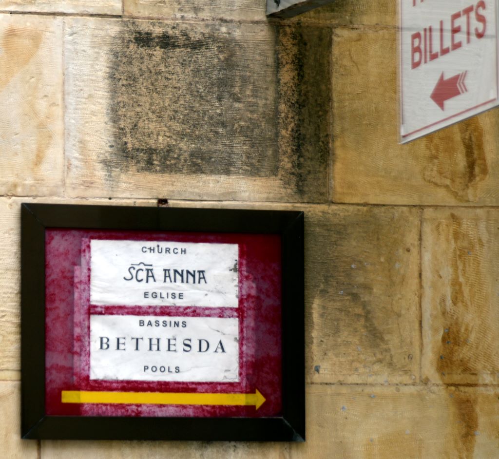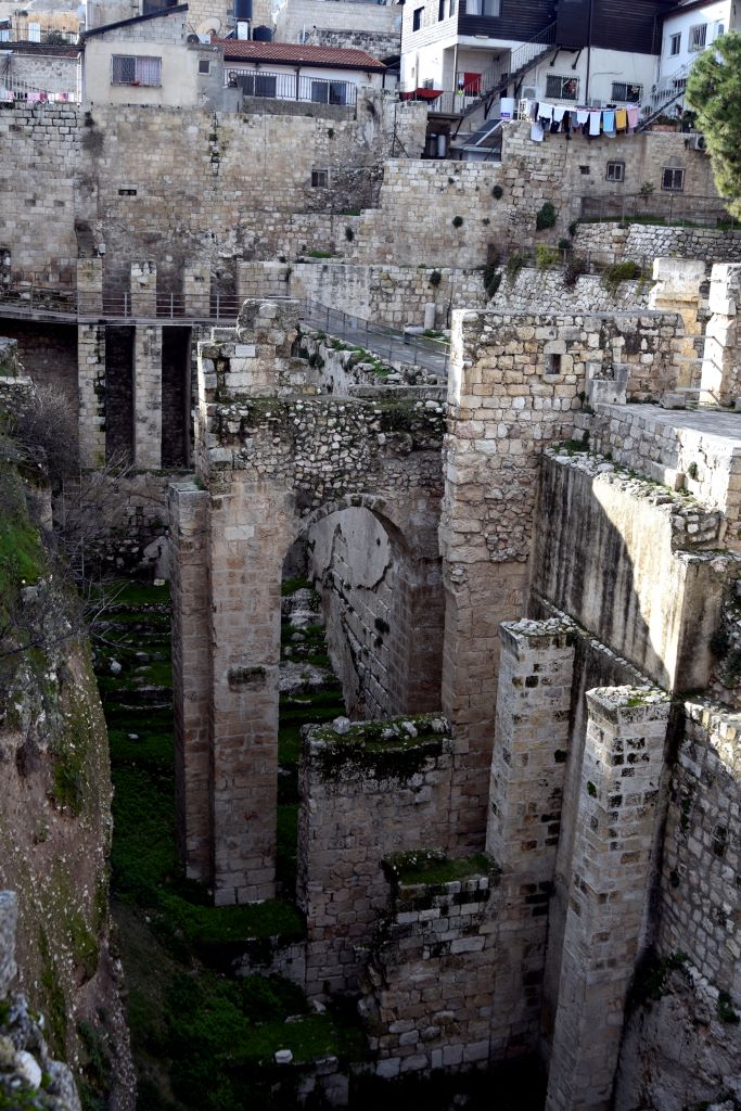 We had entered Jerusalem’s Old City. Any climax associated with such entry was blurred by the contemporary troubles between the Israelis and the Palestinians, the Jews and the Arabs, and the traditions of different Christian denominations. This gate is the beginning of the Via Dolorosa (the sorrowful way) which represents the route Jesus took to his crucifixion, but its historicity is challenged. As we walked into the city, we passed churches originally dating back to the Crusaders in the 12th Century, with compelling names such as Church of the Condemnation and Church of the Flagellation. Their claims to be the sites where Pilate condemned Jesus or where Jesus was flogged seemed unlikely, but they provided atmosphere, as did claims about pavement markings being from games played by the soldiers guarding Jesus. However, the Church of Saint Anne, close to the Lions’ Gate, was interesting for multiple reasons. It is located by the Pools of Bethesda which is where John describes Jesus healing a sick man on the Sabbath (John 5:1–17). The church was built in the twelfth century, and unlike other Christian churches in Jerusalem, it was not destroyed when the Muslims beat the Crusaders. An inscription over the entrance to the church describes it as an Islamic educational institution, and it is believed that the building’s amazing acoustics saved it from destruction. One member of our group sang a beautiful song in the church to demonstrate the acoustics. Outside the church, we also visited ruins including some water pools, though it is not possible to know what the place looked like during Jesus’s time.