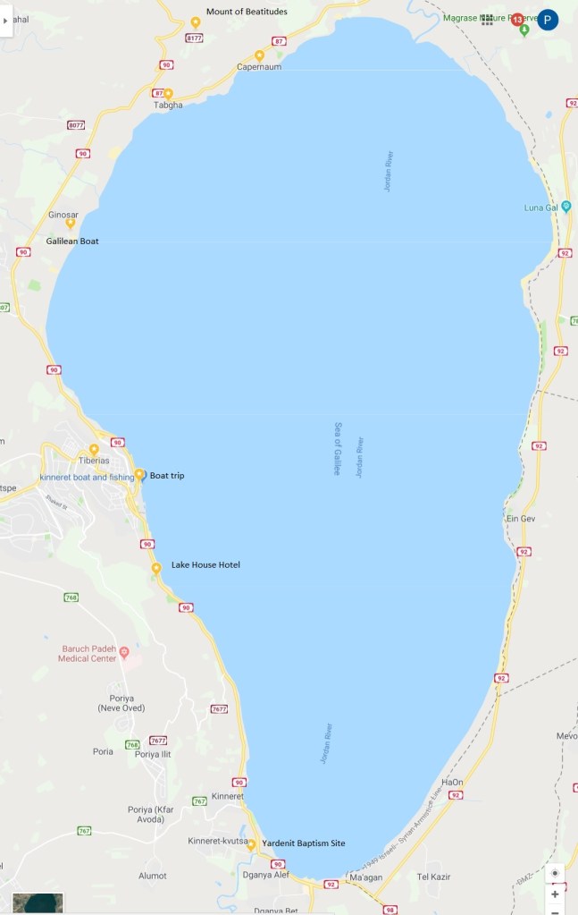 Today was about exploring Galilee and it was a packed day visiting six sites. The map shows the sites we visited though note that the length of the Sea of Galilee is just 13 miles, about a day’s walk.
