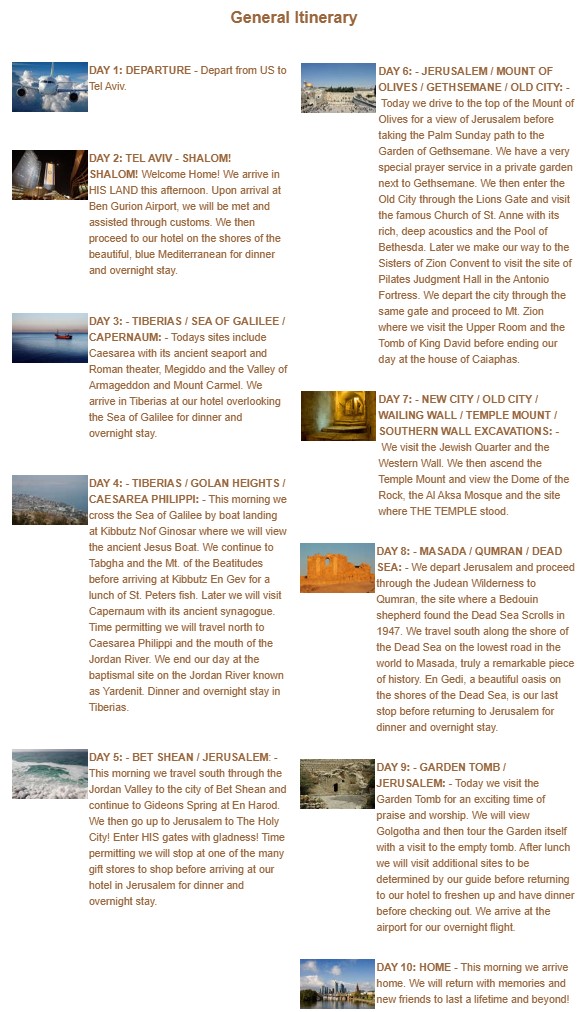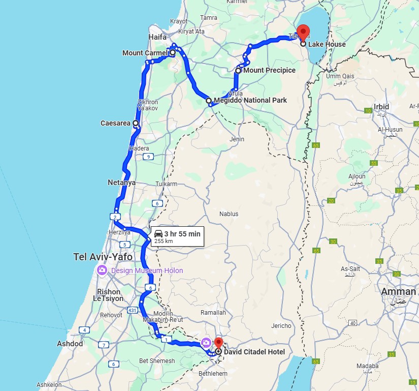 In summary, we were to spend two nights with one full day in Galilee, one day transferring to Jerusalem via Nazareth, Megiddo, Mt. Carmel, and Caesarea, and six nights in Jerusalem.