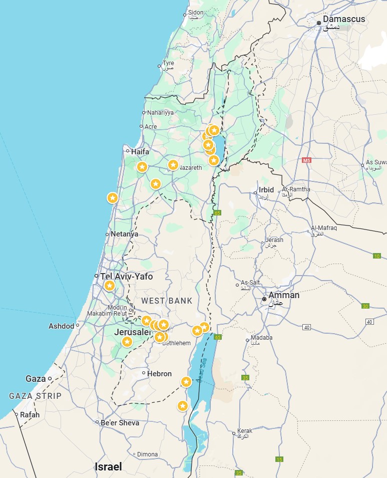 I tried to do my own research in preparation for the tour using The Holy Land for Christian Travelers by John A. Beck and The Christian Traveler’s Guide to the Holy Land by Charles H. Dyer and Gregory A. Hatteberg. I also bought the Lonely Planet guide to Israel and the Palestinian Territories and sought input from a Jewish colleague at work who had recently visited Israel. Such research was generally unsatisfying because it was difficult to process so much information and history alongside the contemporary disputes. With work pressure and knowing we were on a guided tour, the incentive to prepare was low. However, I put our likely destinations on a Google map so I could get my head around where we were going. This emphasized how many places we were going to visit. Note the area in the middle labelled “West Bank” which our bus had to avoid for security reasons and reminds me of the reluctance of Jews to travel through Samaria around the time of Jesus. However, unlike Jesus and the disciples, we did not cross on the eastern side of the Jordan which is now part of Syria.