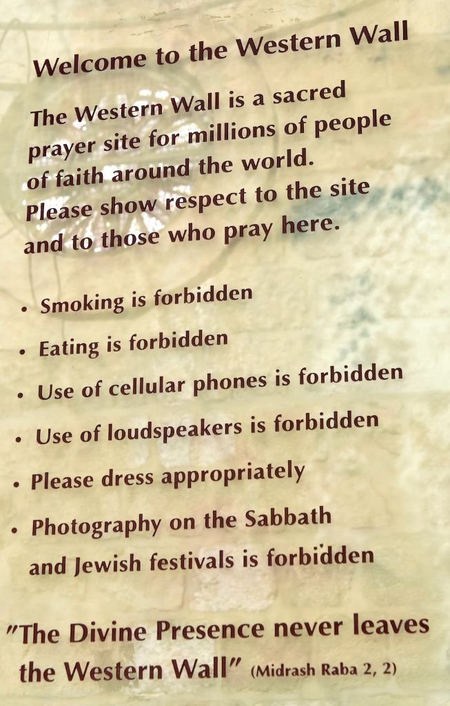 From the church, we headed to the Western Wall, also known as the Wailing Wall in reference to the practice of Jews weeping at the site. It is part of the Second Temple’s retaining wall, dating to before AD 70, and for centuries has been the closest that Jews can get to the site of their Temple as they are prevented from entering Temple Mount by Muslims. The wall is segregated into separate sections for men and women, with women having a much smaller section. Men have to wear a head covering to visit. It is a site used for prayer, with prayers written on pieces of paper and wedged into wall crevices. Twice a year, the pieces of paper, which are treated as holy texts, are removed and buried according to Jewish law. It is also used for Bar Mitzvah celebrations.
