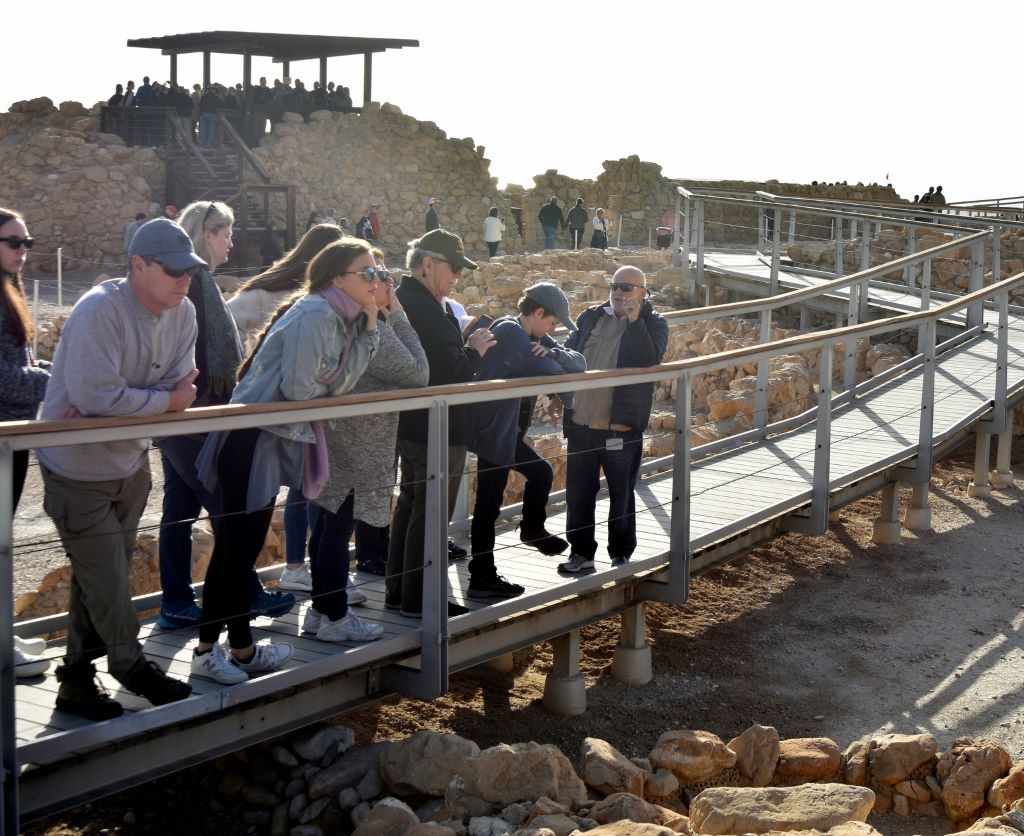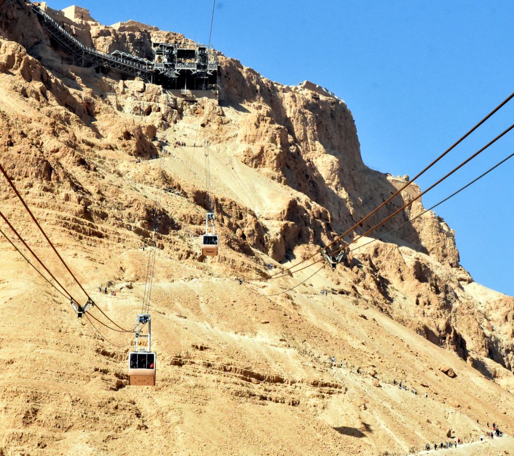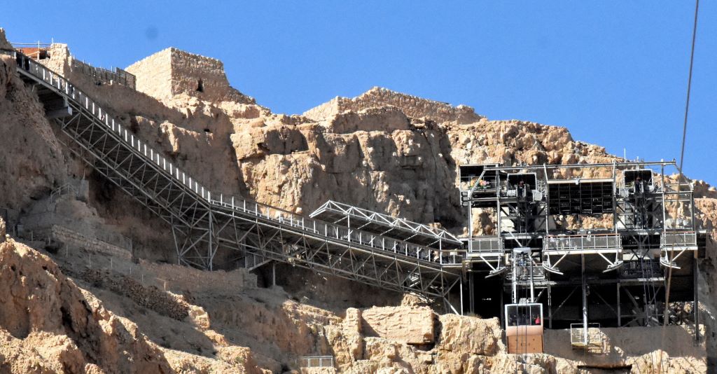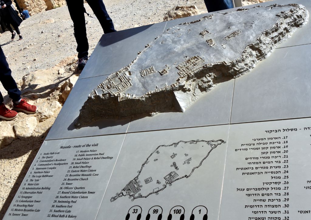 Masada is an ancient fortification built on the top of an isolated rock plateau. Herod the Great built palaces and fortifications on the top of the plateau between 37 and 31 BC. The development included an elaborate system of channels and cisterns to capture as much rainwater as possible. The plateau is 1,300 ft high on one side and 300 ft on the other. After the Romans crushed the Jewish rebellion around the time they destroyed the Temple in Jerusalem, a group of the Zealots called the Sicarii fled to Masada and hid there. In the accounts of the Roman-Jewish historian Josephus, that he wrote in the latter quarter of the 1st century AD, 960 men, women, and children withstood the Romans during the siege of Masada in AD 72 and 73. When the Romans finally broke through with a siege ramp, they discovered that all of the Sicarii had committed suicide except for two women and five children who were found alive. Archaeological evidence does not completely align with Josephus’s account. However, the narrative of such resistance was popular in the early years of Israel’s statehood.