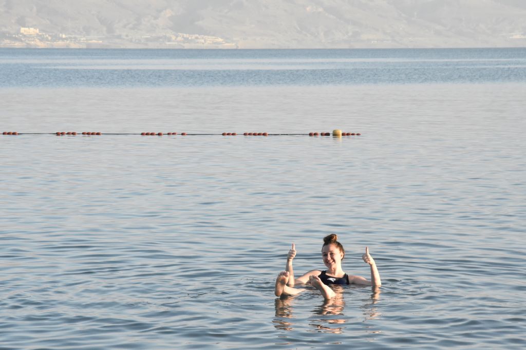 Next was a swim, but because the sea level is slowly dropping over time, it’s quite a long walk down to the water’s edge. We needed to be very careful not to slip on the clay ooze. We had a fun float, which certainly felt weird. Jordan was clearly visible across the water.