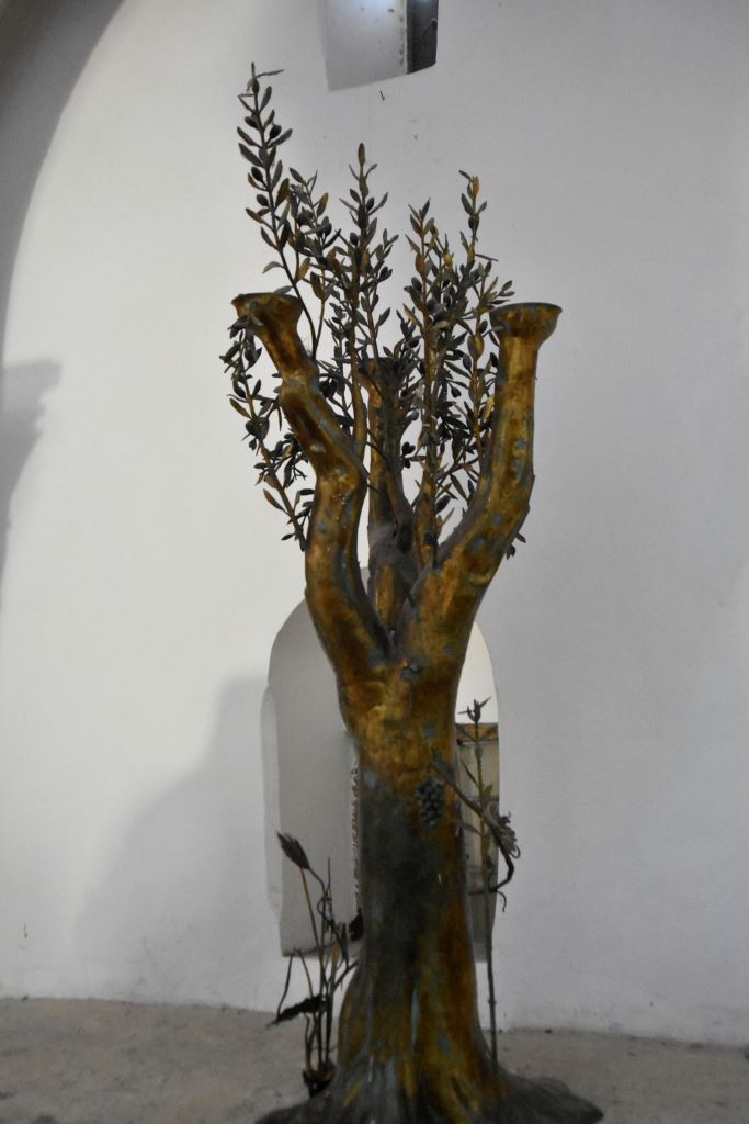 In front of the synagogue is a golden seven-branched Temple menorah as described in Exodus 25:31–40. This is different from the nine-branched Hanukkah menorah which is lit during the Jewish holiday of Hanukkah to celebrate the rededication of the Second Temple at the beginning of the Maccabean Revolt in the 2nd Century BC during the period between the Old and New Testaments.