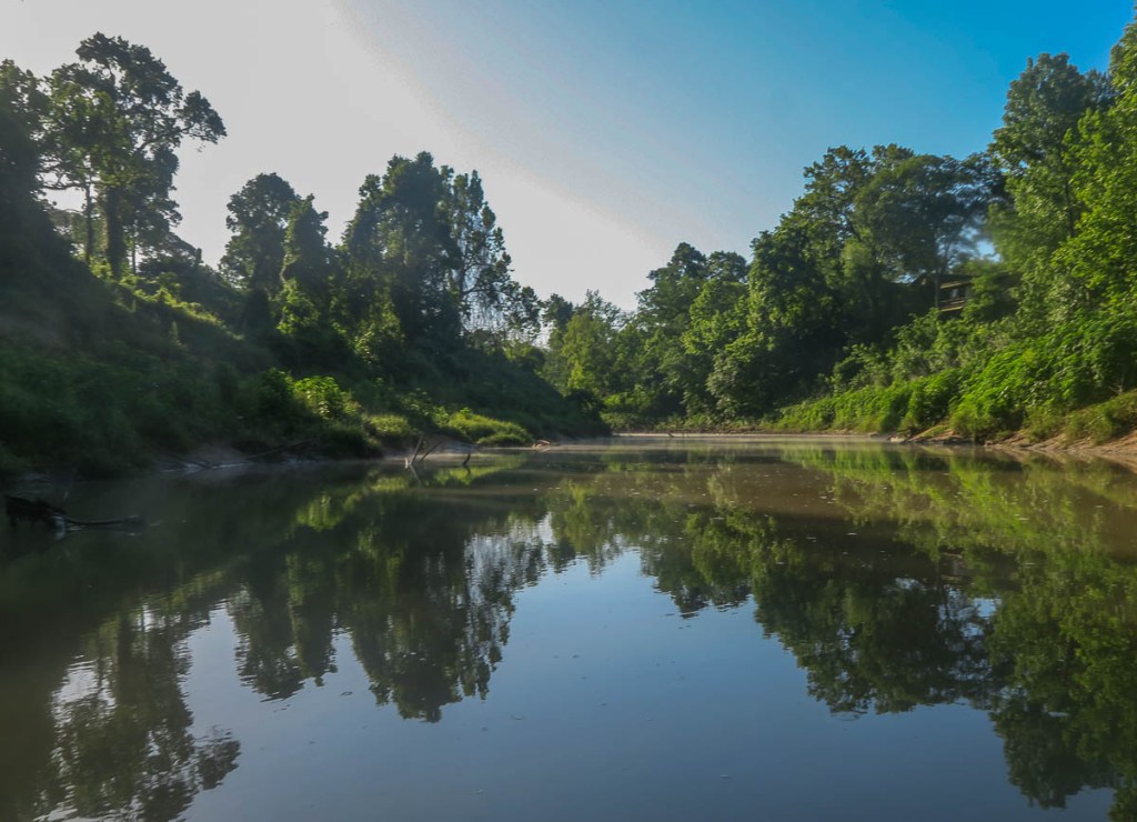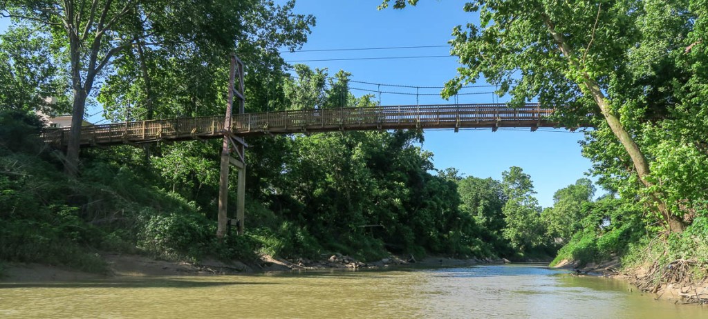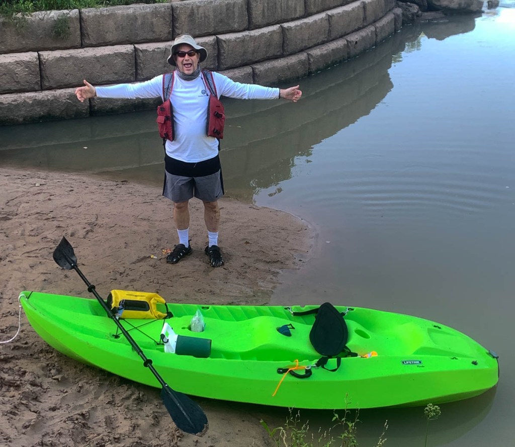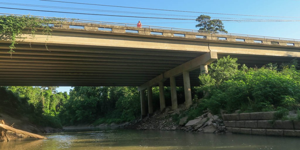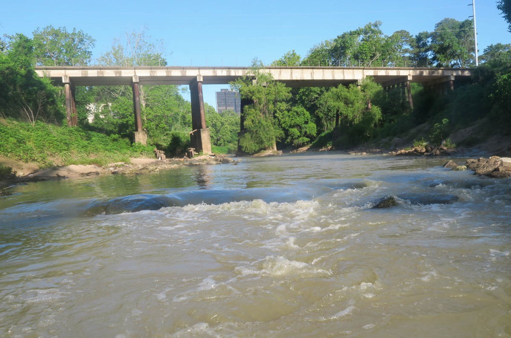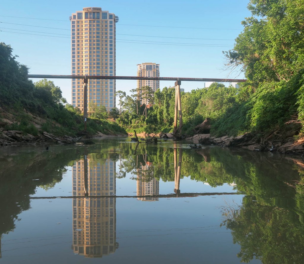 The goal was to paddle to Allen’s Landing downtown (number 10 on the map). The idea of paddling under the big interstates and in the middle of such a big city was attractive, but where to start? The water access location at the Hogg Bird Sanctuary (number 7 on the map) did not appear viable. While locations 8 and 9 looked viable, the trip seemed too short and unadventurous. This left me with starting at location 6, the Woodway Memorial Park, conveniently close to our house. The picture above was taken there. I was confident I would be able to socially distance myself in the middle of the river!