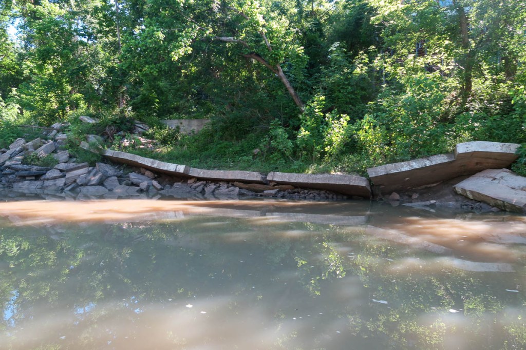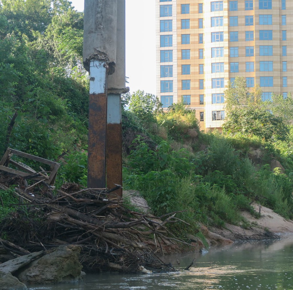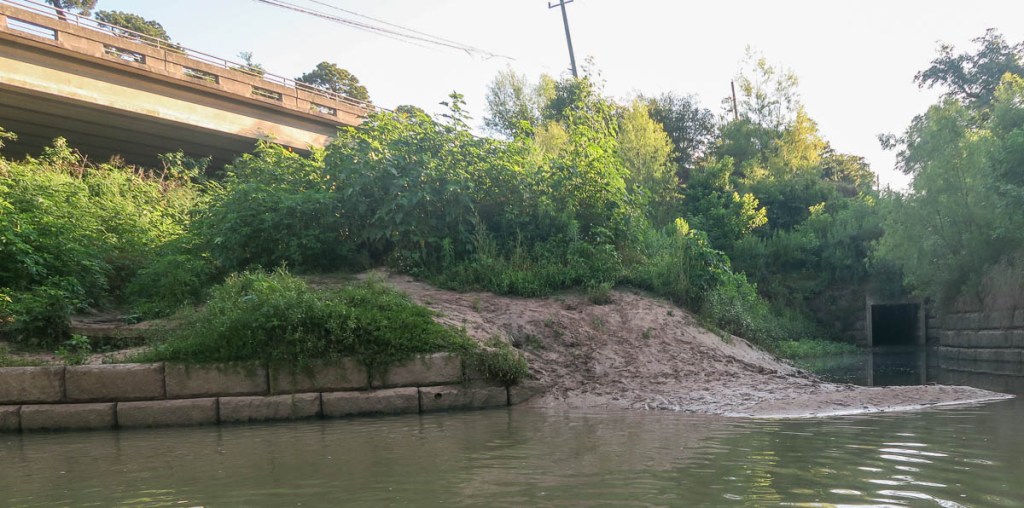 The adventure began. The first section is a beautifully peaceful float down to the Interstate 610 bridge. The sun was still low, so it was cool and the water still. Remnants of flooding destruction remain. The peacefulness emphasizes my distance from anyone else!