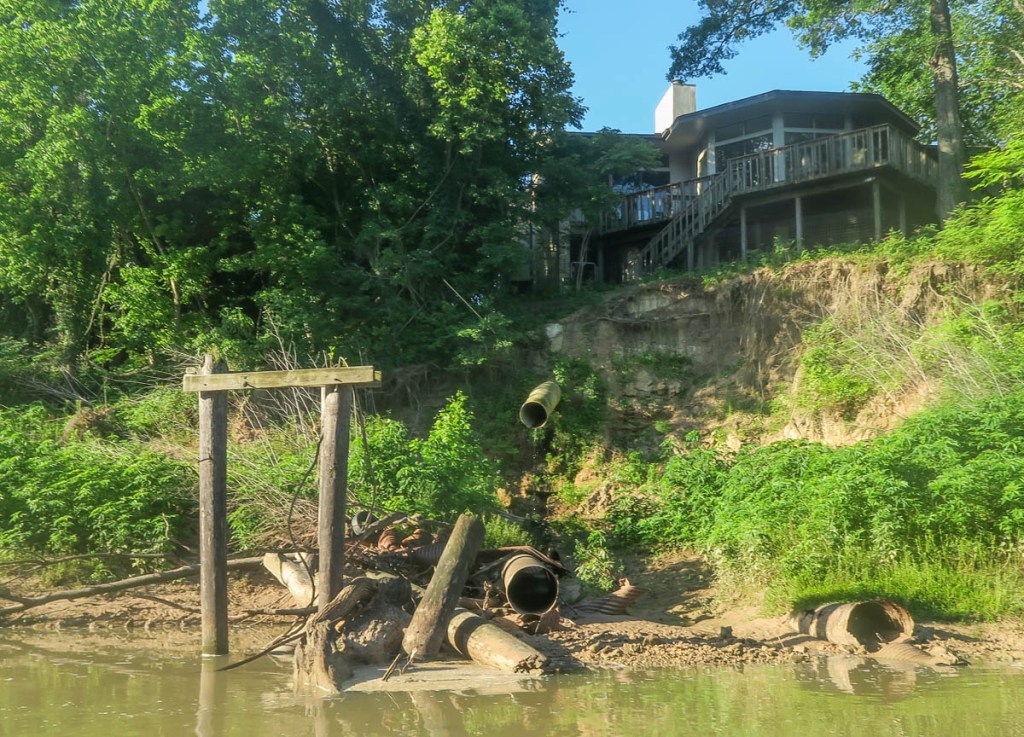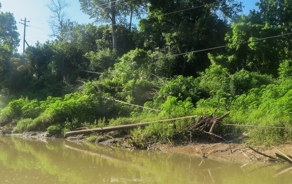 Off I head down the Bayou.I loved how the buildings and blue sky reflected.Piles of debris intermittently littered the banks, where the floodwaters had dragged it to.A pipeline bridge…… whose supports don’t look too good!
