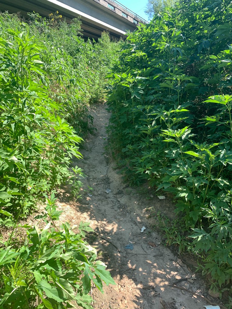The bottom of the trail to the access point is a bit overgrown.The access point with the reinforced wall and the mud bank.Janet looks down from Woodway as I head off into the unknown.