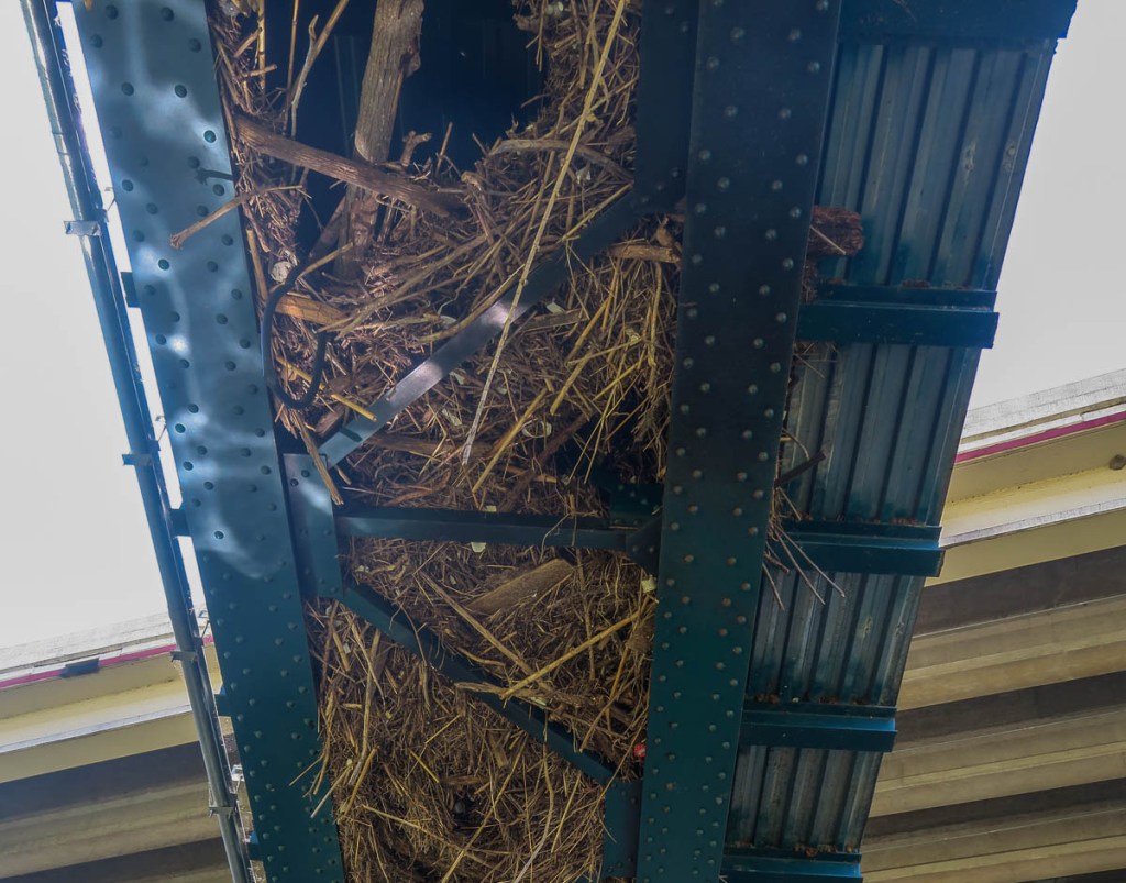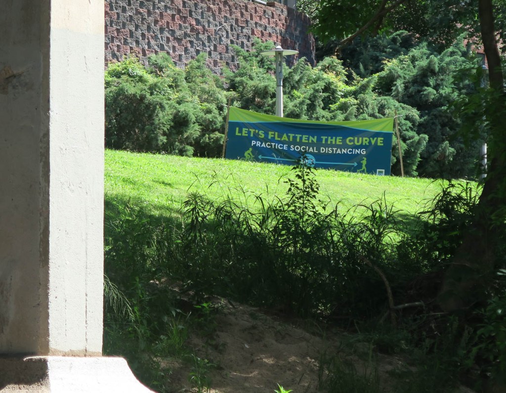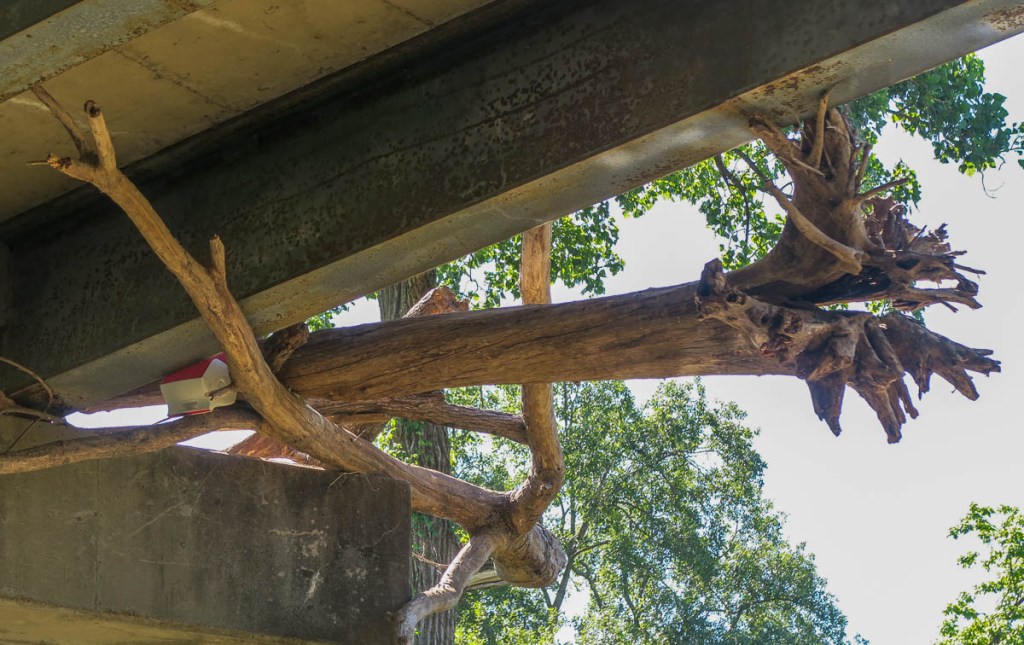 A colorful turtle basking in the sunA pair of ducklings follow their momma.Momma doesn’t like me getting too close!The Waugh bridge which houses her famous bat colony.Martins enjoy nesting under the bridge, as well as the bats who are sleeping in the cracks.The Waugh bridge is not just for martins and bats.A perfect spot for lunch in Eleanor Tinsley Park: a sufficiently isolated seat in the shade.The skyscrapers mark the end of the trail, so not far to go. I picked up a trail closure sign that had been washed away by a recent flood.Downtown Houston – here I come!