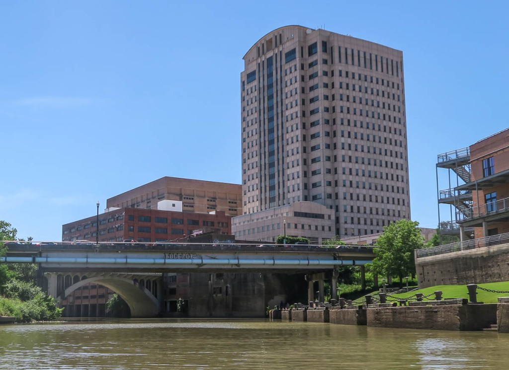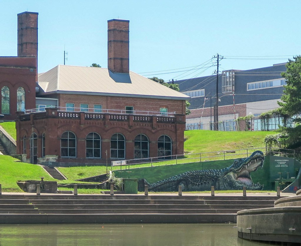 Water Access Point number 9 by Sabine Bridge.Berms catch floating plastic debris to prevent it flowing to the bay.This was the only other canoe I saw all day!Interstate 45 looks rather different from below.Steps leading up to Sesquicentennial Park which was created to celebrate the 150-year anniversary of the founding of the city of Houston in 1837 by the Allen brothers. The tree trunk, caught underneath a road bridge with a cooler, brings back Harvey memories. More Harvey memories, with lots of debris underneath a rail bridge.The Gator Wall of the University of Houston – Downtown. The only gator I saw on this trip. I’m not sure how many saw me :).Allen’s landing, where the Allen brothers founded Houston in 1837.Under that bridge, the river leads to the Houston Ship Channel, Galveston Bay, and the Gulf of Mexico.My journey ends where Houston started.