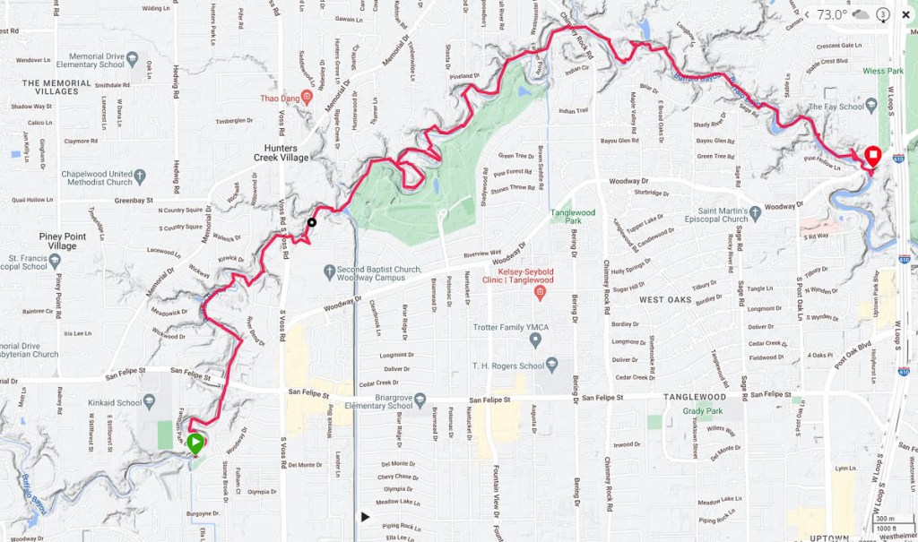 This trip was 5.3 miles and took 2.5 hours. The water was calm (there hadn’t been recent rain). We passed under several bridges that we often go over and could see golfers from the Houston Country Club. The takeout at Woodway Memorial Park is also straightforward as described in the previous post. This leg is a great introduction to paddling the bayou!
