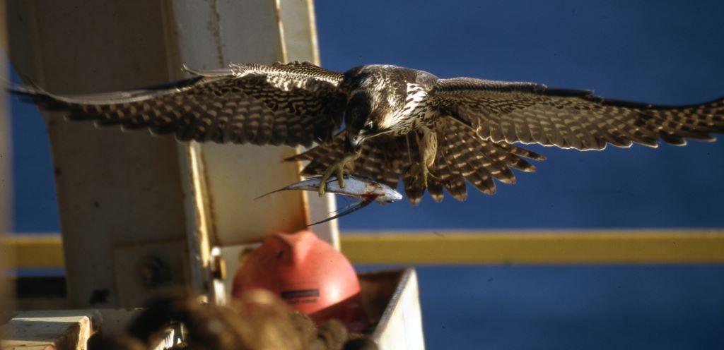 The downtime gave me time to take photos of the birds that hung out on the ship. The Egret on the deck was not an issue, but I had to get over my fear of heights to climb to the top of the mast, when the ship was under way, to catch the Peregrine Falcon that hung out for a while.
