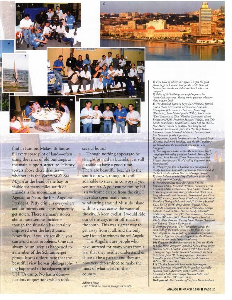 After the trip to Ireland, it was better to return to Luanda rather than Pointe Noire because of the instability. Also, the renovation of the Soyo base had progressed sufficiently for operations to restart from it. While operating out of Soyo helped by avoiding Congo customs, there were the expected challenges associated with starting a new base. There were multiple Schlumberger product lines at the Soyo base, all trying to restart their operations, and the sense of comradery was fantastic. Life in Soyo was straightforward as one only had to worry about work; we lived in a camp with catered food, though my first trip to Soyo had been somewhat unnerving. As the plane approached the runway, you spotted a couple of plane wreckages and some surface-to-air missiles. Having landed, the main door of the ten-seat aircraft was stuck, and it took them fifteen minutes to open. When we drove off base, there were white or red painted stakes in the ground on either side of the road. White meant the land had been cleared of landmines, but the clearers were South African mercenaries in whom I did not have total confidence. If I needed to turn around in the road, I was especially careful not to drive off road into an adjacent field, even when the stakes were white. I remember seeing a group of children running through such a field. Nothing happened, but I still get chills thinking about it.