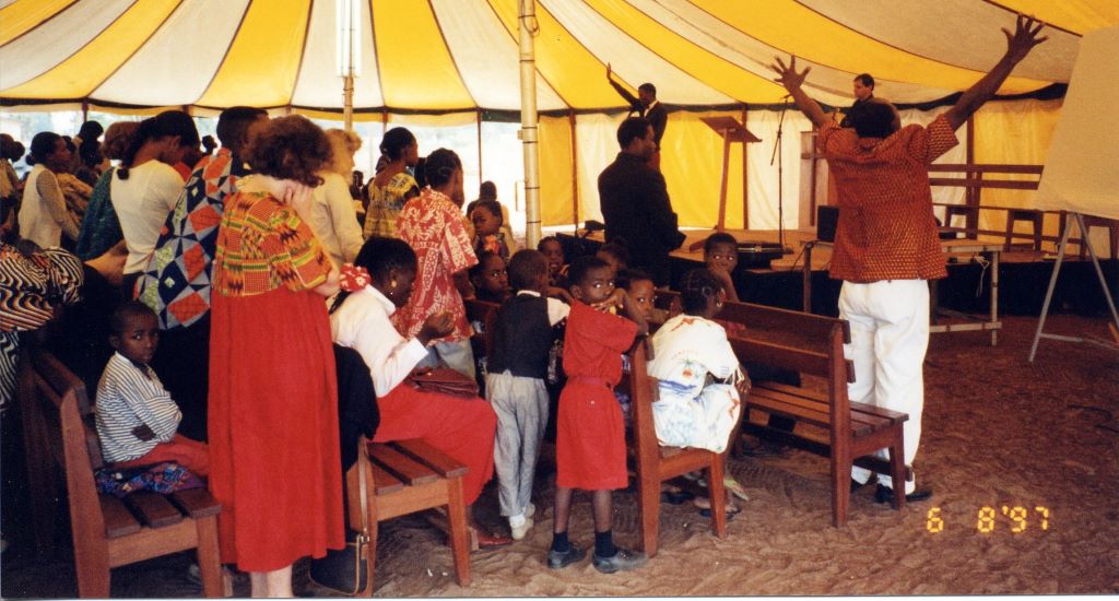 With a marriage on the horizon, I decided I needed to take my Christian faith more seriously. Eric Hollebecque had mentioned a church run by an expat couple in a circus tent by the airport and I became a regular attendee of a congregation led by Gary and Janice Dickinson, US missionaries with the Assembly of God. The messages and singing were in French (mine was weak) with some translation into the local language, Munukutubu. The congregation was a fascinating mixture of locals, expats, and Russian women. The Russian women had married Congolese men who had visited Moscow for education, looking for an escape from Russia. That church was where I have most clearly felt the presence of the Holy Spirit, while in contrast, I felt the presence of evil most strongly when driving around town. For Gary and Janice, Pointe Noire was home. They sent their teenage daughters to boarding school in East Africa before they attended college in the US. Gary had been ravaged by disease but was miraculously healed on multiple occasions. They have continued planting churches in this region, and after twenty-four years in Congo, moved to Libreville in Gabon, just up the coast, to establish a Bible school. I saw how they were largely on-their-own while I was supported by Schlumberger. I realized that their work required a strong calling, one that I did not have! On 4 May, Gary baptized me in Pointe Noire harbor.