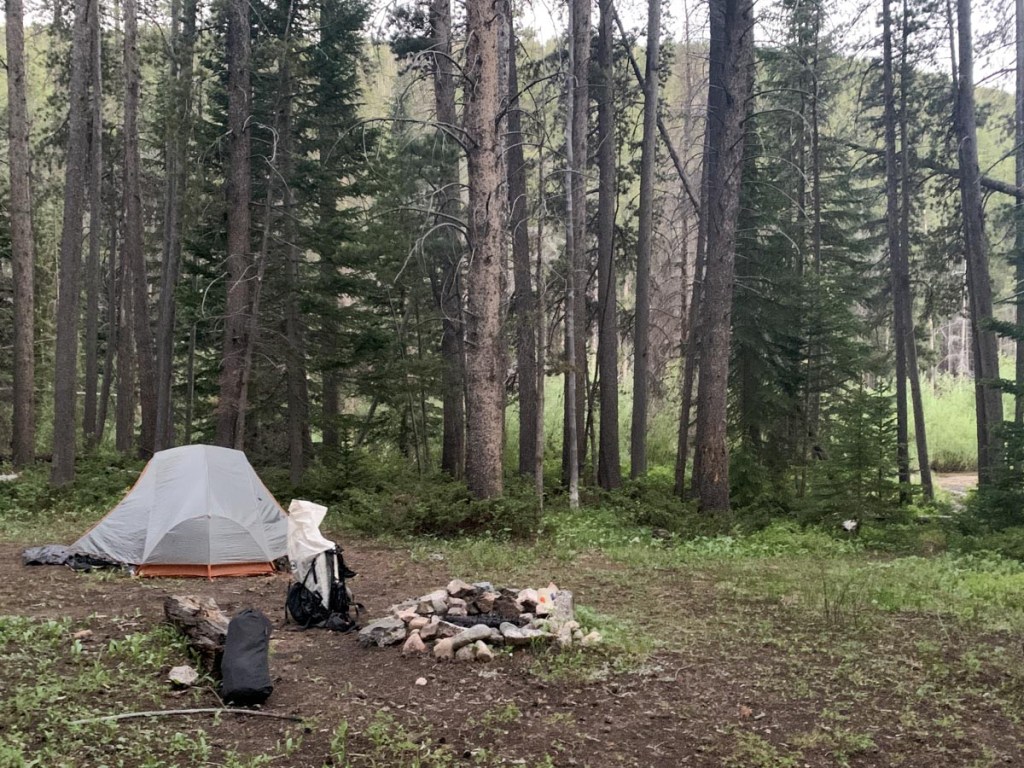 On the trail at 12:15 at Monarch Crest after leaving car. Steady climb for first five miles went from 11300 ft. to 11900 ft. Met friendly bikers and hikers including pilot who used to work for NASA who was stocking fish in a pond. Strong sun and wind. Still some cool snow. Both across the path which led to falls and cornices. Enjoyable lay down at the saddle then watched two mountain bikes skid down the path whom we followed. After a couple of miles passed a Colorado trail maintenance crew that were rerouting the path. Lots of moose poo but no moose (learning later it probably wasn’t moose poo…) Found a perfect campsite after a total of 10 miles. P gave his lower legs an ice bath in the river and S’s nose exploded. Gathered and filtered water and had an enjoyable chill dinner before hanging all smellables through fear of creatures and in bed by 8:30. S’s first time day one hasn’t been too bad. Thinking about how we can go a bit further the next couple of days but we will need to see. Luxury item for next time: extra spoon. Just one means you have to fight over who eats!