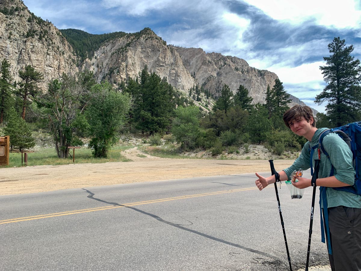 Up at 5 and on the trail by 6:30. Not as cold as previous morning. Pleasant and fairly flat 6 mile hike out to chalk creek trailhead. Just before descending hill to trailhead passed two large groups of people who were actually part of the same group. They had stayed at bootleg campground. We stopped there to use the toilet and have some snacks. Large bear box completely full of individual bear boxes and lots of MSR bladders hanging from a tree but no one in sight thinking this was there base camp and they were heading to brooks for one night. Also met a nice couple day hiking up from chalk creek. We crossed chalk creek and decided to try and hitch into town. After not seeing a single vehicle going our way for the first three minutes we were getting worried. But then the first vehicle stopped a pickup truck with a very nice man with two nice dogs. The guy was setting up cabins and hopefully a shop by Hancock on the CW side. We hopped in the back of his pickup truck and he was happy to take us to the resort. At the resort felt odd asking at the posh reception for the restaurant but they were very friendly and it was the breakfast menu as it was 10:15. We enjoyed pancakes and bacon and ham and apple juice and lattes (decaf for Peter). The two couples at the table next to us had finished their hike the day before at the resort having bailed two days early, so they had lots of spare food which they offered us and we gladly took a selection. (we forgot to ask for their names 😦 ) We had cell phone service so p checked in with mommy and agreed meeting arrangements with Paul Ryan. We went to the shop and food selection was limited but we found hot chocolate, three musketeers, and saltines. Checked with reception to see if we could pay anyone for a ride to the next trailhead but no luck. While very friendly and professional we noticed a striking difference between that professional hospitality and the kindness of strangers we have met so far on our travels. So we set out on the long three mile walk up the 1300 foot hill with hot sun. Once again tried to hitch and this time it was the second car that stopped only because the first one was full with stuff. It was one of the smallest cars we’ve ever seen in the states. A Chevy spark. And already quite full with stuff and a cat but Samantha Sunshine was eager to give us a lift as she had spent many years without a car hitching in Hawaii and Europe. She had just been filming with her cat an advert at the resort and had previously posed for them as a mermaid. She even went out of her way to take us to the trailhead along a rough bumpy steep gravel road. Even offering on the way up to stop on the way down to pick up a hiker who had just summited Mount Princeton. She kindly took our photo at the trailhead and we wish we would’ve taken a photo of her and her car but only thought about it 5 minutes after departure. This hitch made all the difference, setting us up later for Yale.