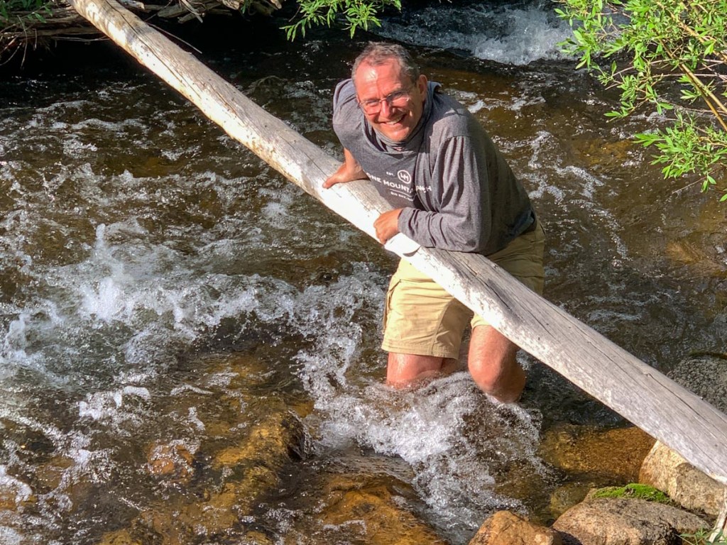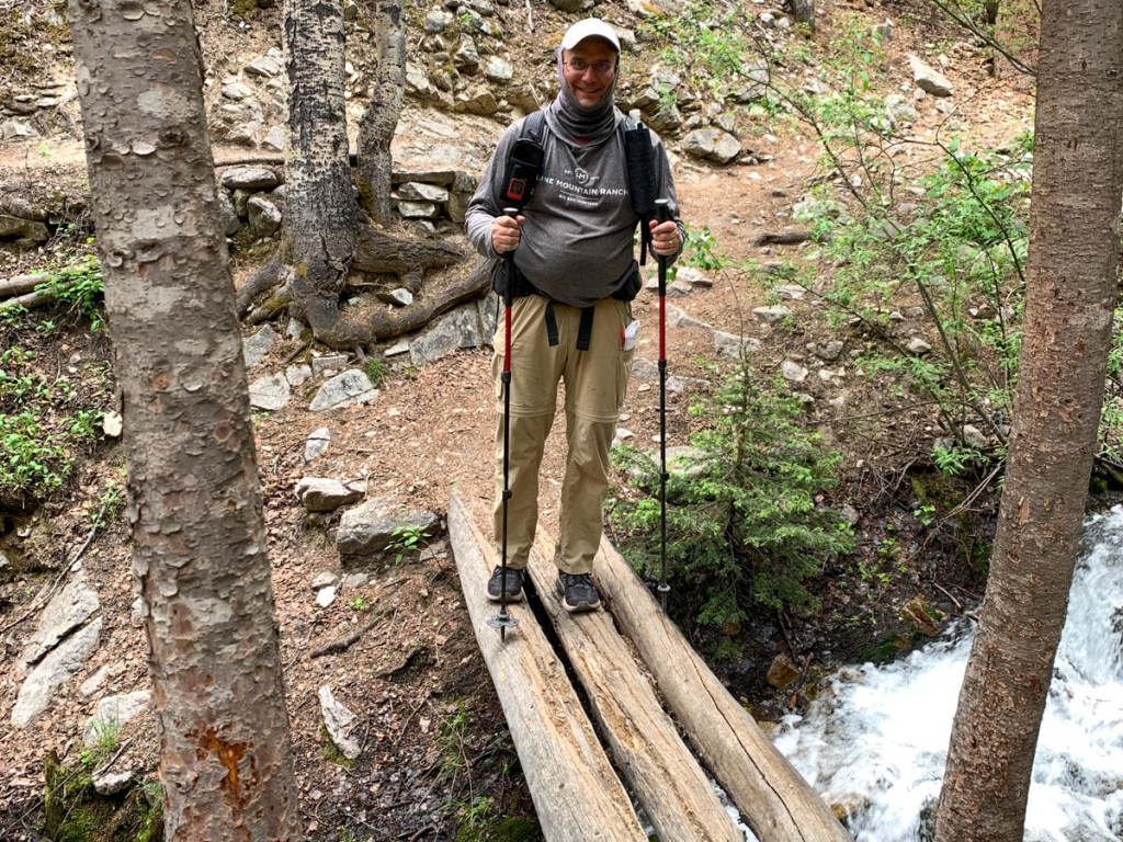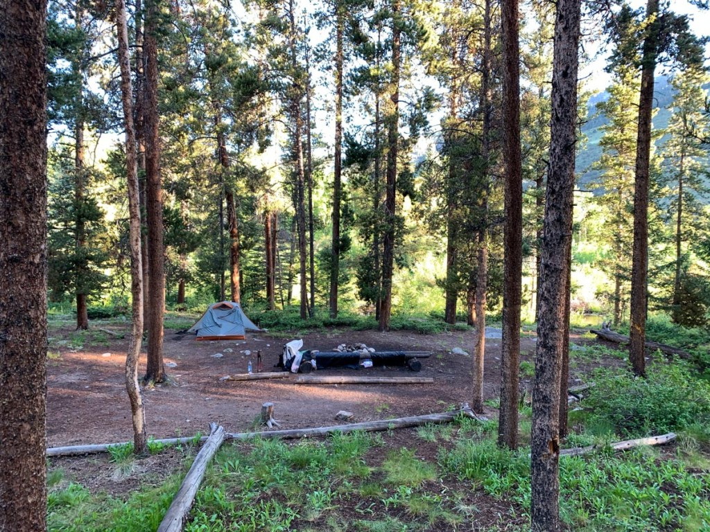 Stopped for lunch at Maxwell Creek and even laid down for thirty minutes in limited space barely noticing a group of 10 guys heading southbound. Having enjoyed the donated pepper sausage and dried mango and trail mix we marched on. After a while, passed a lone cyclist and then after a while longer, S saw an unleashed dog closely followed by a bike but the dog was so well behaved. We made it to the river but it was about half a mile more until we found a nice large campground right next to the river and laid down for a short nap. Ate protein bars, had cold soak in river and collected water. A couple offered us a trout which their son had caught but we couldn’t cook. They were from Little Rock Arkansas and had traveled in the UK including Isle of Skye, the Lake District, Isle of Wight, and the Chunnel. They had twin 26 year old boys. The one fishing had just finished third year of medical school which was a huge amount of studying. The other son had studied abroad in Italy and Germany and was an anthropologist and had recently visited Tanzania and seen tons of animals. We filtered our water and were sorting out food when it started to rain a little so we tried putting up our rain shelter. Not much room underneath but otherwise looks good. Felt more relaxed tonight than previous night and it is a little warmer as we go to sleep. We have a plan to hike tomorrow to the tree line below Yale ready for a very early start the following morning to hit the summit at sunrise after hiking by moonlight. We shall see what happens!