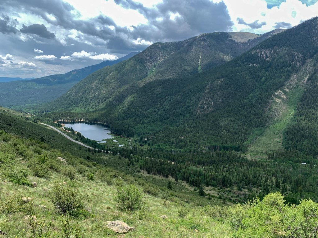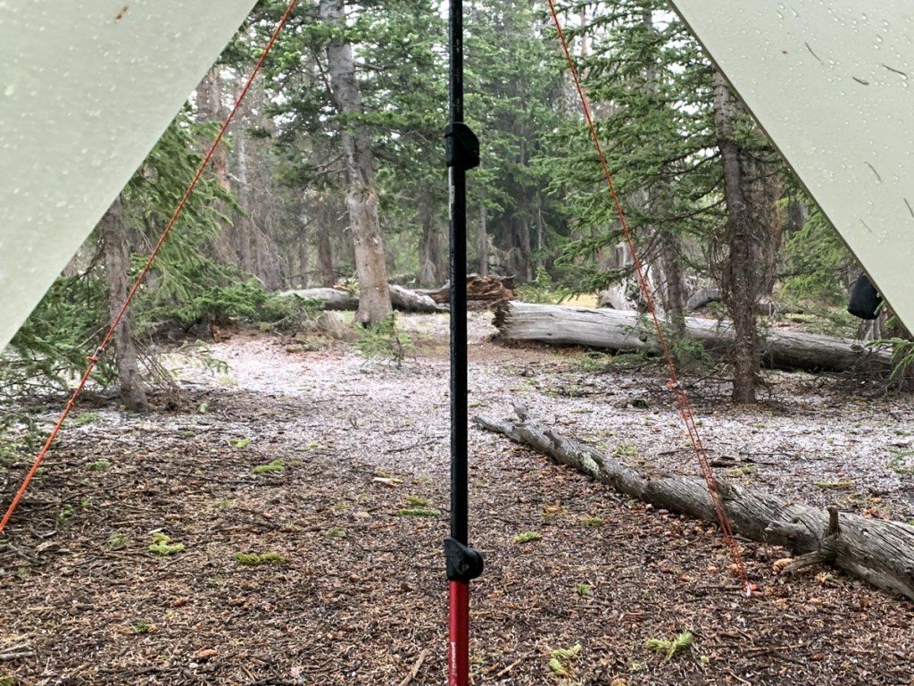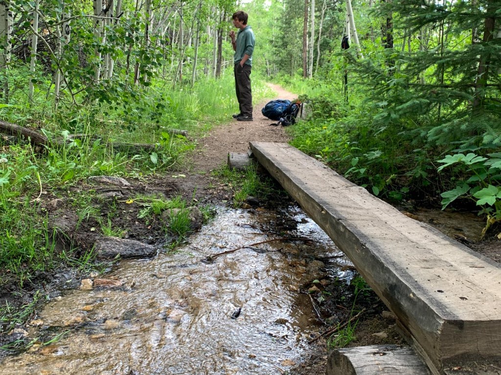 Good nights sleep. P did not have to pee. Alarm at 6. P up at 6:10. S up at 7. After a relaxed breakfast watching and listening to the river packed everything up and was on trail at 8:30. A woman walking a friendly lab passed by. A bridge over the river was a very short distance down the trail. Immediately the trail seemed narrower than we had had before and more overgrown. S’s nose had a bad explosion just before four day hikers passed by so we weren’t feeling very social. A pair of backpackers called Bruce and Bryce passed by hiking fast and they too were doing the Collegiate Loop starting from Twin Lakes (but we did not see them on the other side). Got to the trailhead then crossed the road to Avalanche Trailhead where there was a welcomed toilet. Carried on a short distance to a small river where we filtered into all water bottles and filled the bladder for that night. Several dog walkers passed by during this time. Started the 2500 ft. climb over three miles. After entering the wilderness, multiple switchbacks in open hillside allowed the view of the valley and lake below to continuously open up. Supplemented by a vast array of wildflowers. We entered the forest which gave some protection from the sun which was thankfully often covered by clouds. We plodded on up the hill only stopping for the rare water break and at one point overtaken by a trail runner. We eventually made it to the top and collapsed on the plastic bag and stared at the sky. The sky was threatening so we put up the tarp shelter first and were thankful as we had intermittent rain storms including hail throughout the rest of the day. We followed the trail to Yale to just above tree line to check it out. There were still large patches of snow and we Facetimed mommy. We headed back to the shelter and shortly after the first pair of CT hikers had arrived hiking south bound named Ashley and Josh. They had the same brand backpack as P but looked very light with only three sections of their roll mat. We put the tent up shortly before the temp dropped 20 degrees and a 15 minute hail storm causing hail drifts. We got ourselves organized and cooked dinner just when the previously mentioned trail runner arrived out of nowhere from the Yale trail wearing just a thin waterproof top her backpack shorts and trail runners. She described her route to the top and how she descended off the ridge during the worst of the storm but still made it to the top with help of her Gaia and always moving to keep warm. It was remarkable to think someone had just done that. We chatted for awhile about the hike and other Colorado peaks before she ran off down the mountain. We ate our dinner quickly as we were cold, filtered our water, took down the tarp, and were happy to be in our sleeping bags by 6:30. Still not sure what time we will start in the morning. The weather forecast is for a low of 39 at our elevation and a 20% chance of rain. As we write this we can hear the rain on our tent and the wind in the trees but at least there is no thunder.