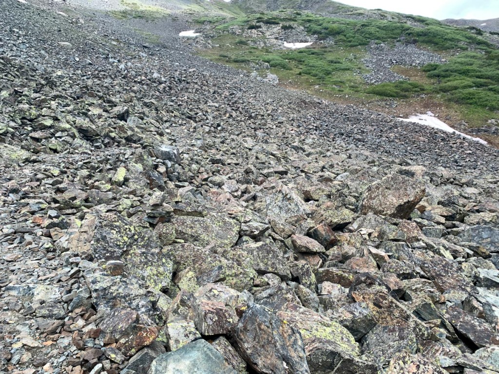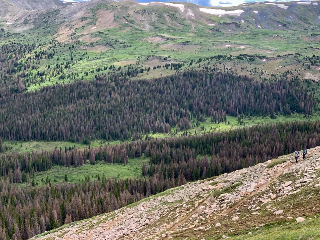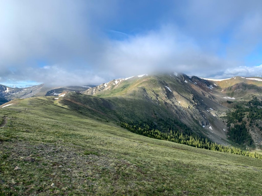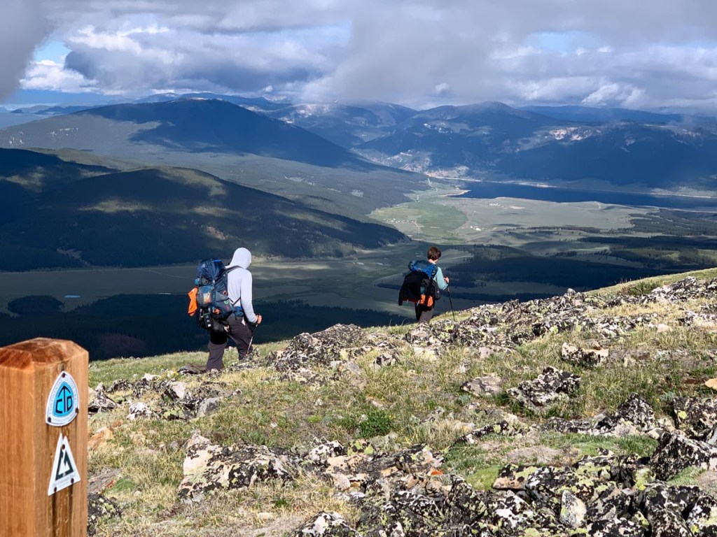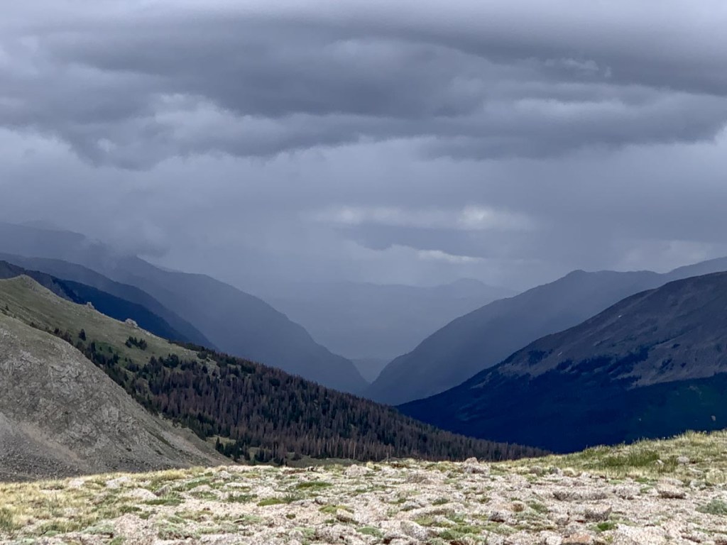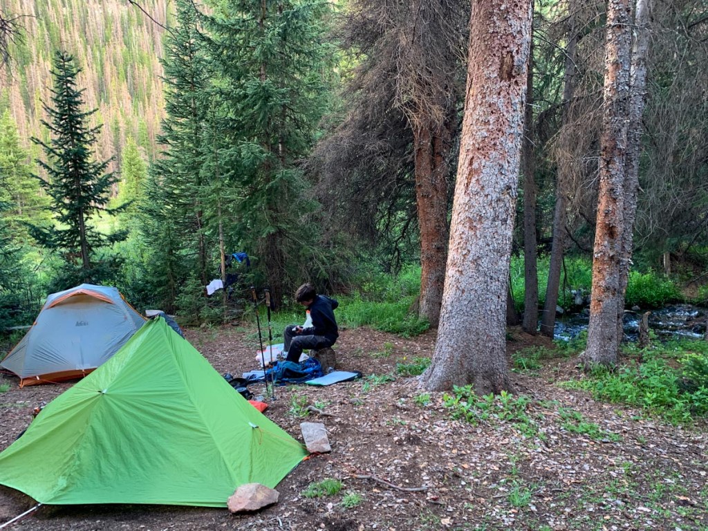 Up at 5. P got up at 1 am and the tent was in the clouds but he slept well after that. S had a relatively sleepless night so was very tired. Temps were very cold but above freezing but it didn’t feel too bad as there was no wind. Fixed breakfast while watching the sunrise catch some of the surrounding mountains and reflections in the lake. Started hiking at 6:45 and it was a long hike into the ridge above the campsite and we soon warmed up. After one mile we reached a high point overlooking Cottonwood Pass and there was a three sided wind shelter which helped us delayer. There was also cell service so we could catch up accordingly. We walked for another 4 miles above tree line and enjoyed the continuous endless views and hiked hard to get up to the Sanford saddle and continental divide at 12750 ft. Tremendous views looking back where we’d come from and it’s amazing how far we’ve come We look ahead, guessing where the next pass is. We hiked down reaching the next high point at mile 10 which was a ridge off Emma Burr mountain. We had seen maybe 10 CDT hikers. On many occasions had to carefully make our way through snow drifts which were both slippery and a risk of sinking. On the passes we also enjoyed a lot of our snacks. The weather forecast had indicated a higher chance of rain after 2 pm so we pushed on to get over the final pass at about 12 miles. Storm clouds gathered around us but never impacted us directly. We had some tough hiking through rock fields which we all struggled with but we made it to the final saddle by 3 pm. From there it was a 4 mile hike down a steep mountain to the North Fork Chalk Creek where we wisely used Guthook to find a very nice campsite in the trees by a stream. We were all exhausted and initially just collapsed but then got to work trying to dry out equipment and get organized. None of us had much of an appetite so we drank and had a few snacks and was in bed at about 8. It seemed warmer which makes sense as we are so much lower. We will see what tomorrow brings. The forecast is for similar weather. We’re all tired of the dehydrated dinners.