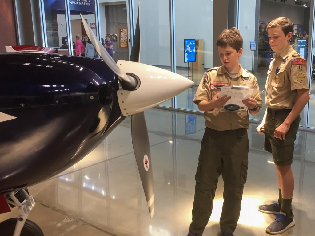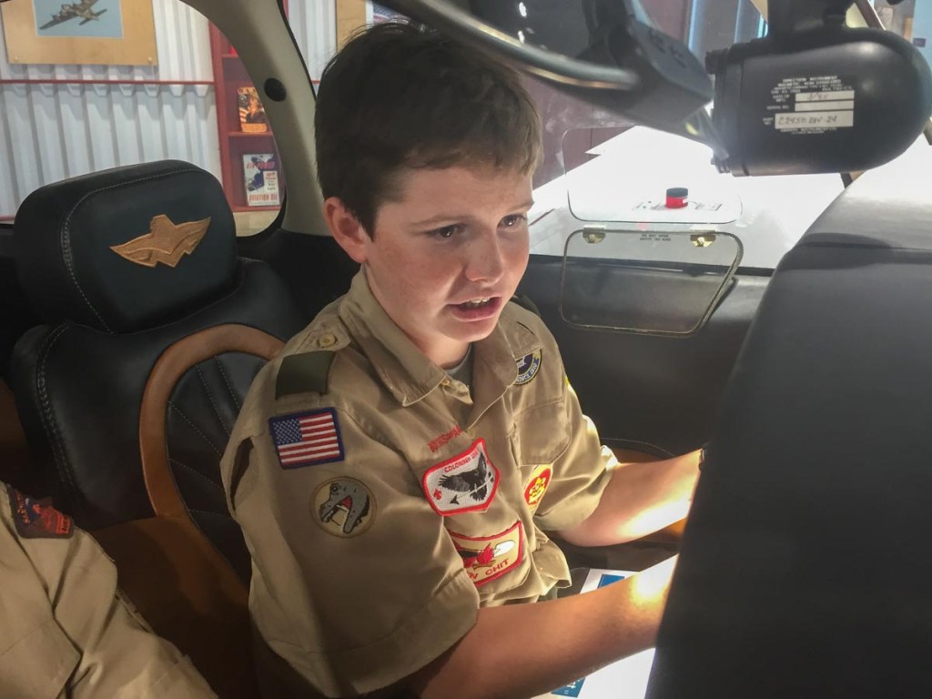 Samuel and I returned to Colorado later that summer for a 50-mile backpacking trip that completed his Backpacking Merit badge, but that will be described in a separate post. Troop activities continued with a canoeing campout on “Scout Island” in the Colorado River near Bastrop in October, followed by the Aviation Merit Badge at Lonestar Flight Museum in December.