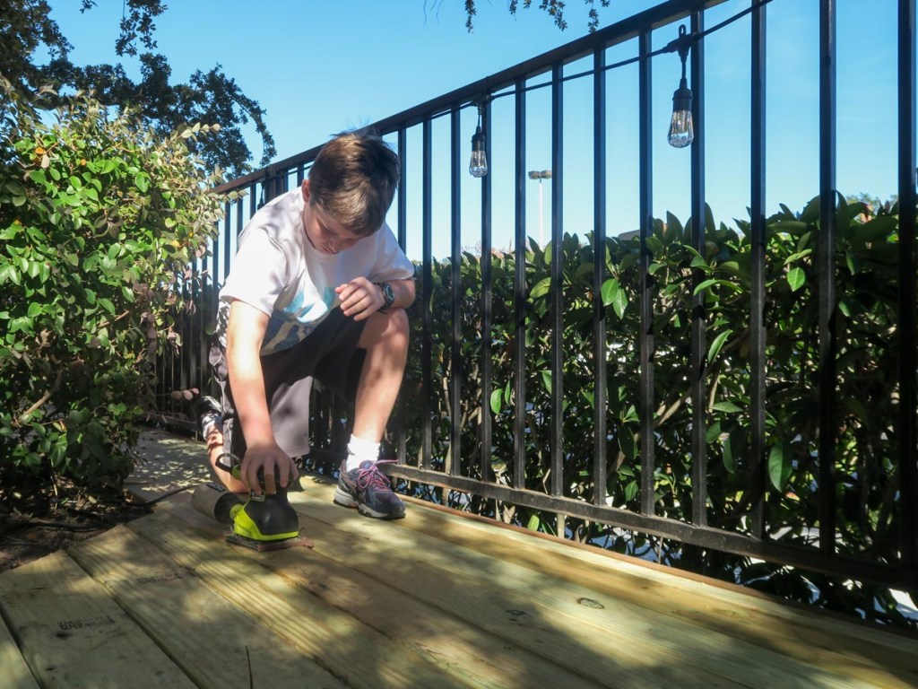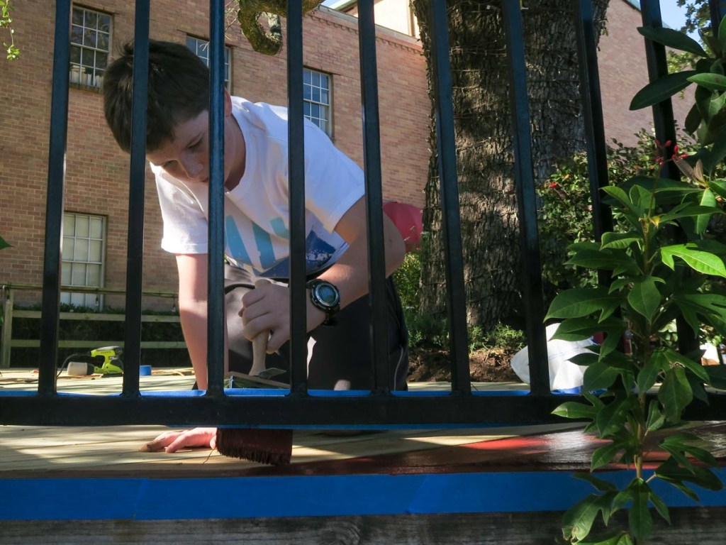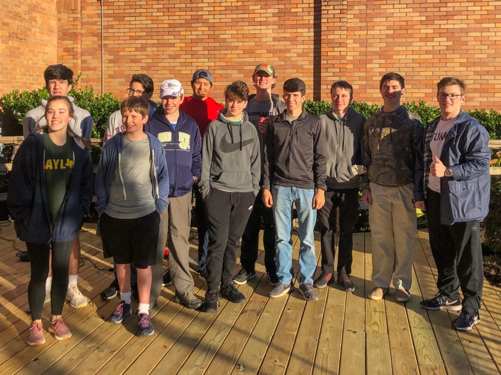 December 2018 also brought the culmination of Samuel’s Eagle Scout project. Earlier in the year in June, he’d selected the revitalization of the deck outside C-gym at school and got it approved, but a lot of preparation work had to be performed before the project day. He worked with the school to get the wood replaced by contractors and to get approval for the color and benches. He prepared and stained a small section of the deck to ensure it would work as intended, and realized the wooden railing would need refinishing as well to match. Project day came on December 15th with kind weather, and ended with an exhausted Samuel!