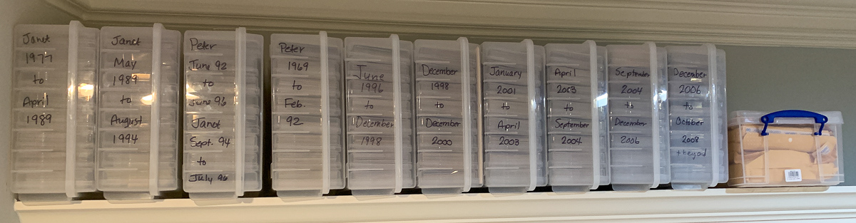 This is (nearly) the final step in a major exercise to digitize all of our photos. We also used an Epson Fastfoto FF-640 to scan all of our prints. That cost $450. Amazon only seems to sell the FF-680W now which is $600 and wireless. I was happy with this for what it did, but be careful setting expectations too high. The main advantage of this is that it will feed the photos. It allows multiple photos to be stacked, but more often than not multiple photos would feed at the same time, so I ended up feeding one at a time. This took about 1-2 seconds per photo, which is much quicker than a flatbed. We had approximately 15,000 photos (generally 4×6 prints) in simple albums without additional information which took up a whole large bookshelf. After scanning, the photos are kept in 10x “IRIS USA 4″ x 6″ Storage-16 Inner Keeper Organizer Cases Storage Containers Box for Photos.”