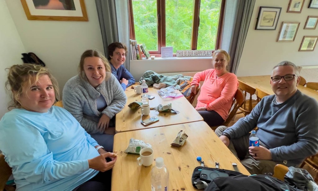 The low route took us along a forest road about 4 miles to Black Sail Youth Hostel. The rain was getting harder with stronger winds so we just kept going, hoping it wouldn’t get worse. The valley opened up to an amazing scene of multiple rivers merging together with waterfalls. Unfortunately, the rain got harder, the wind got stronger, and the trail steeper. It was like the hurricanes we get in the Texas when you are told to shelter – but we were in the middle of it in mountains. The rain stung our faces and the wind would have blown us off our feet if we did not have hiking poles. We made it to the bottom of Loft Beck and then it was one mile straight up the hill. It took strong concentration and one step at a time to keep going in the torrential rain and gale force winds. We finally made it to the top, helped by Peter shoving chocolate into everyone’s mouth halfway up, but it was still 3 miles to the Honister Mine cafe and her famous sausage rolls. The path remained relentless. While the rain eased, the wind seemed to get stronger. The last mile was down an old tramway’s path, but it was slippery rocks which made it worse. Bailey went ahead to order what was possible before they closed at 5pm, and managed to get some hot chocolate and a couple of snacks, but we were devastated that they had sold out of sausage rolls! Just as Tracy and Peter were approaching Honister, Samuel appeared out of the mist. While we thought we’d been drowned rats, Samuel defined what one looked like!