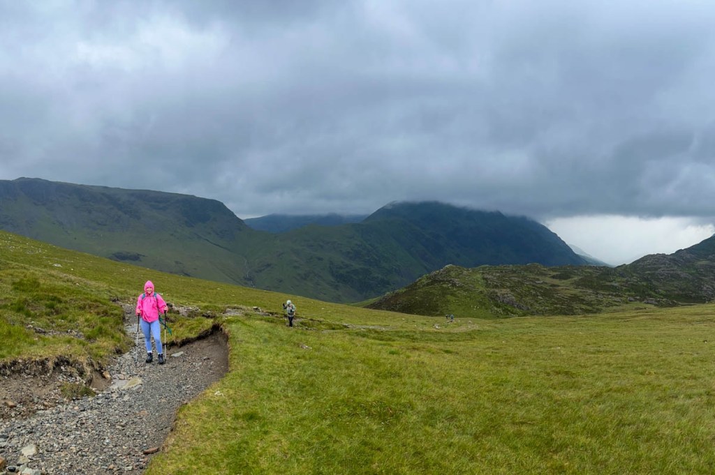 The day started well after a great night’s sleep, being lulled to sleep by lamb bleating! After about a mile, the path took us along the south side of Ennerdale Water for 3.5 miles. The scenery was fantastic and the surrounding fells got bigger and bigger, and their shrouding in cloud ever more ominous. The previous day’s weather forecast had evolved to a dry and windy morning but wet afternoon, so we made the most of the morning! A rock formation known as Robin Hood’s Chair was the main challenge in this section, though the path varied from awkward rocks to a river bed. After leaving the lake, the Ennerdale Youth Hostel provided the perfect place to eat our lunch in their break room, while also helping ourselves to tea and snacks, courtesy of an honesty box. Well refreshed, we were ready to head out into the promised rain. It didn’t look too bad so Samuel headed off to tackle the “high route” while the rest of us took the low route.
