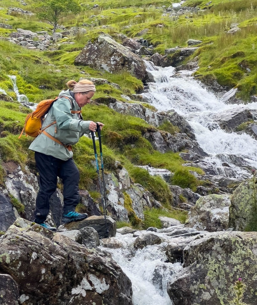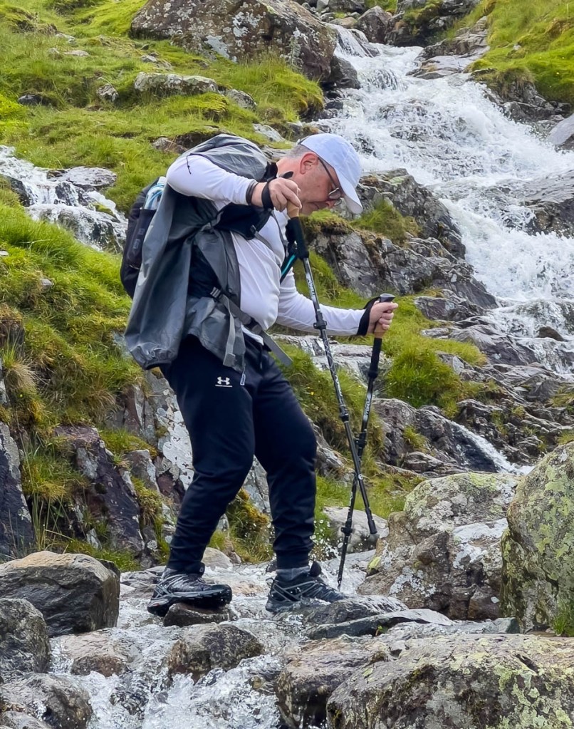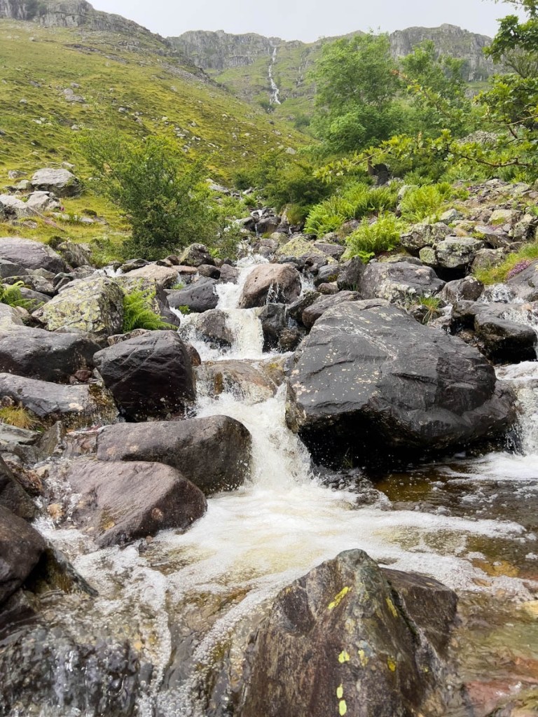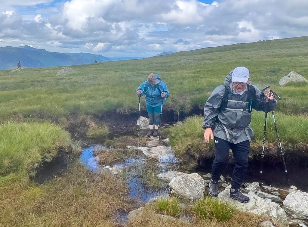 The 8-mile distance of this leg disguises its challenges, illustrated by our taking 7.5 hours to complete it. It started with rain but fortunately that soon cleared up and intermittent blue sky brightened our ascent out of the Borrowdale valley. The recent rain swelled the rivers and filled the waterfalls. Bridges were rare so we crossed many rivers by various forms of rock-hopping and wading. While we appeared to be making good progress towards the top, the volume of water coming over the waterfalls made me suspicious that we had much further to go. Our pleasant hike up the valley suddenly became a lot more serious when we realized we had to hike up a literal waterfall under Lining Crag. The team coped remarkably well, rewarded with a flyover by some RAF jets and lunch. The next challenge was navigating the peat bog at the top of Greenup Edge before starting our descent towards Grasmere.