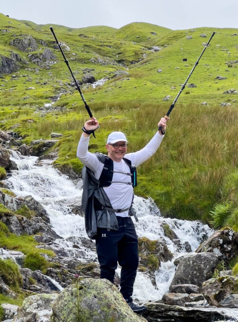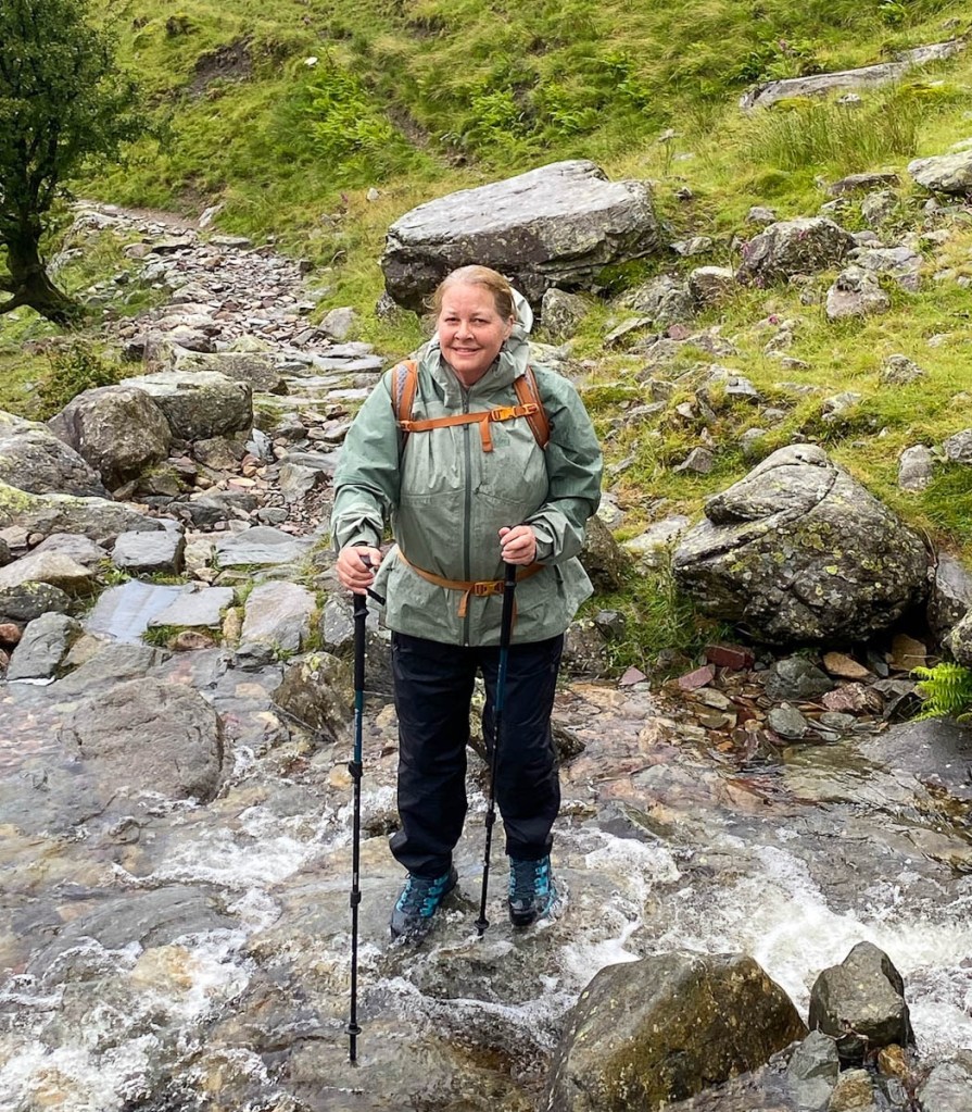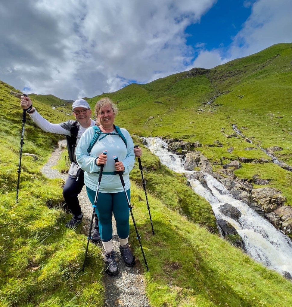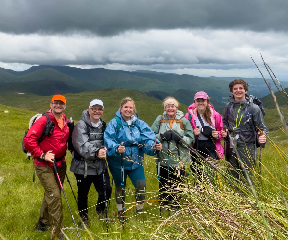 The 8-mile distance of this leg disguises its challenges, illustrated by our taking 7.5 hours to complete it. It started with rain but fortunately that soon cleared up and intermittent blue sky brightened our ascent out of the Borrowdale valley. The recent rain swelled the rivers and filled the waterfalls. Bridges were rare so we crossed many rivers by various forms of rock-hopping and wading. While we appeared to be making good progress towards the top, the volume of water coming over the waterfalls made me suspicious that we had much further to go. Our pleasant hike up the valley suddenly became a lot more serious when we realized we had to hike up a literal waterfall under Lining Crag. The team coped remarkably well, rewarded with a flyover by some RAF jets and lunch. The next challenge was navigating the peat bog at the top of Greenup Edge before starting our descent towards Grasmere.