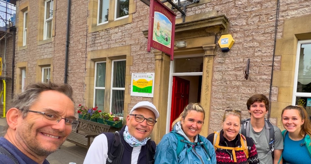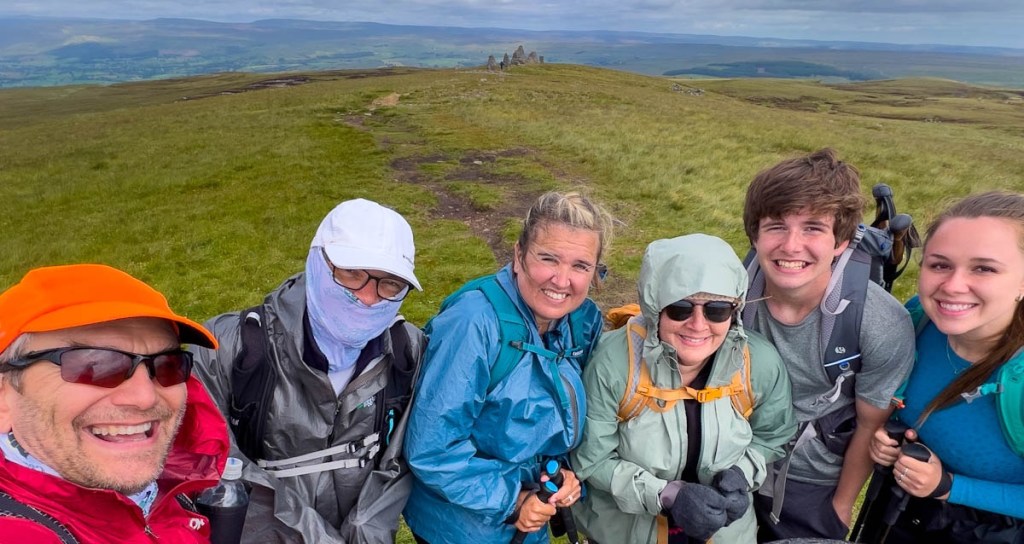All of Team Sloth together again.As we left Kirkby Stephen, this sign showed we were nearly halfway, a milestone we would reach today.Initially it was a long steep climb around a very large quarry, accompanied by lamb bleating!As we approached the top, we enjoyed a quick snack break, huddled behind a windbreak.The Nine Standards were close, and the path remained dry and firm.The Nine Standards were built by the Romans, with one theory that they represented soldiers.For us, they provided a great windbreak for lunch.A fun flyby shows off the Nine Standards which mark the watershed along the center of England. In one side, water flows to the Irish Sea, where we had started. On the other side, water flows to the North Sea where we are heading. Kirkby Stephen lay behind us in the distance.We were happily refreshed after lunch!The moorland included plants that looked like cottonWith uncertainty about the bog, we took a “before” photo of shoes and legs! We took the recommended “red route” which started off well but we knew it wouldn’t last. Samuel led us on the best path through the bog.It became more difficult to find a dry path. Samuel conceded and got his trail runners wet, but the rest were still keen to stay dry. But in the end, the non-waterproof shoes got soaked, but the water was “clean.” Someone passed us, walking through the bog in bare feet, carrying their shoes!Bailey enjoyed the comfort and style of her Hokas, while also keeping them clean!Tracy and Janet were not impressed by the bog…… but we all enjoyed chocolate hobnobs to celebrate getting through! The valley opened up, with some strange farming patterns on the opposite side.And we passed some “butts” used for grouse shooting.The streams are brown due to tannins from the peat in the water.We were very happy to see Ravenseat Farm up ahead, home of the Yorkshire Shepherdess.After a brief rest, we were ready for the final stretch to our B&B, without appreciating the final slog yet!The first sign to our B&B took us off the main approach to Keld, and also shows another type of Coast to Coast marker.As we headed up the valley, we realized our destination was a climb up the other side of the valley!! It was fun watching a hay baler in action.The pains of the day, especially the last mile’s climb, we’re quickly forgotten with tea and cake, and we were all smiling for today’s finisher’s photo.We are in such a beautiful location. There won’t be any passing traffic keeping us awake tonight, but there might be lambs…We will be heading back down the valley tomorrow for our next leg, after too short a stay at this idyllic location.