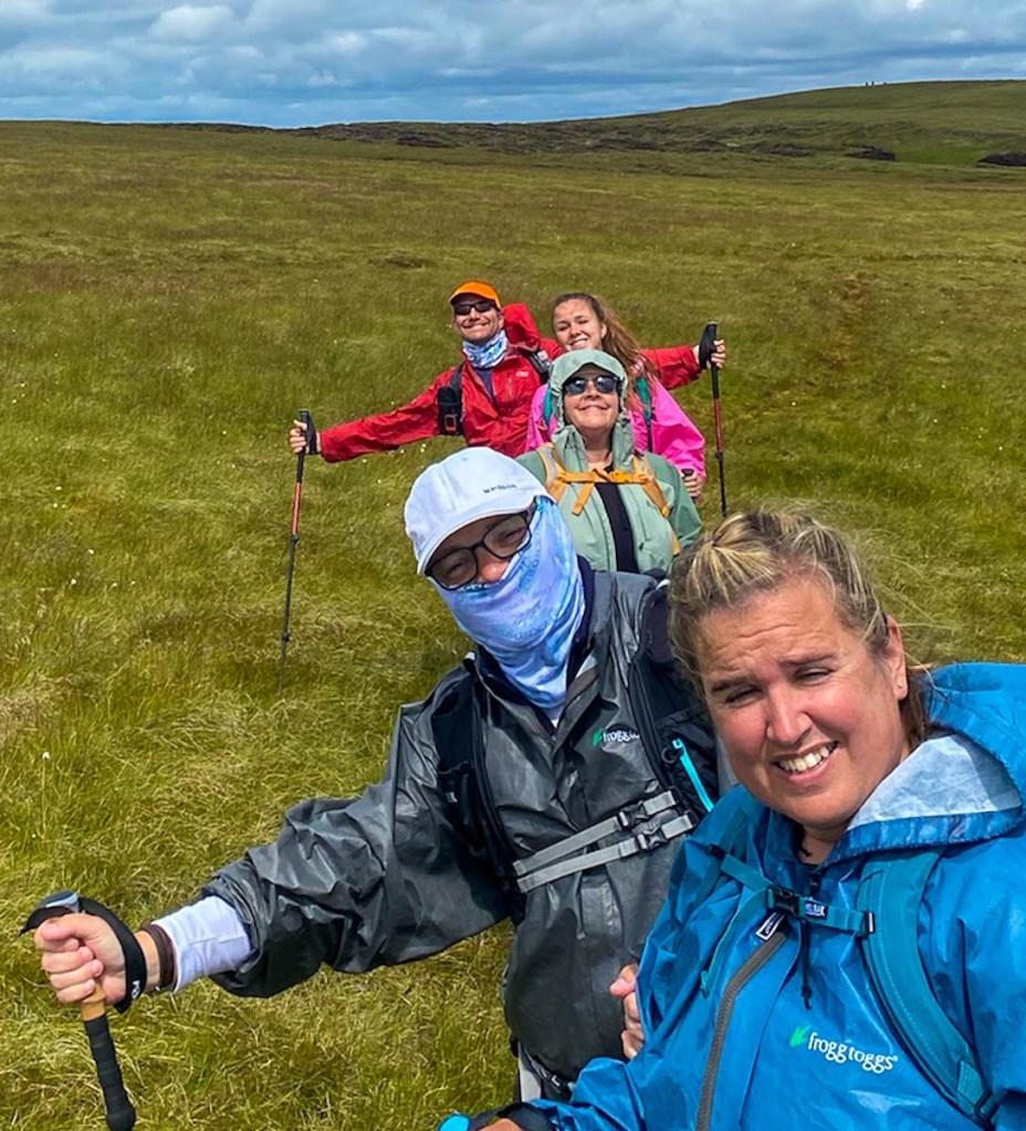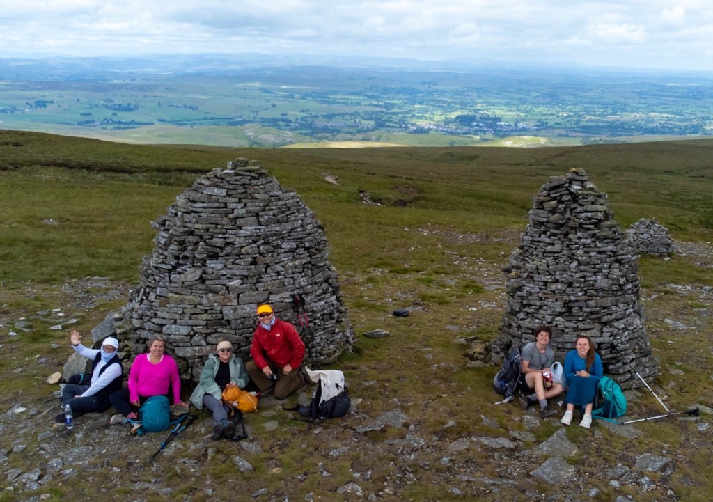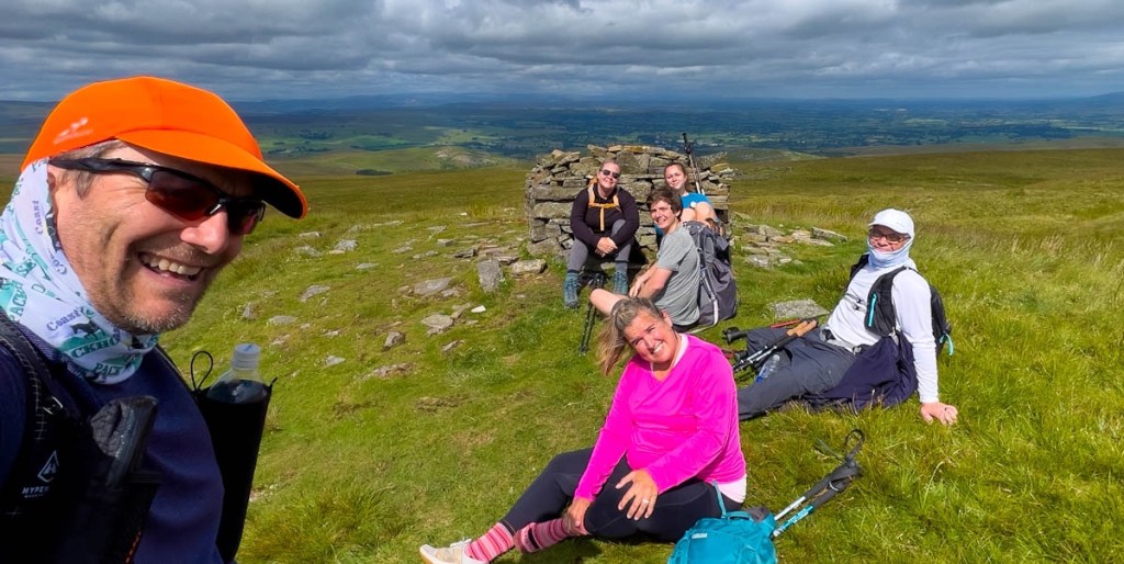 The day started well with the usual grand breakfast, even better this time with omelette options which were great. After a bit of meandering through Kirkby Stephen, we were soon climbing up past a very large quarry to the sound of bleating sheep. Our apps showed two different routes and we chose the road which suited us. The road turned to path and we kept going, with the occasional view of the Nine Standards. After a brief pause behind a wind shelter, we pushed on up to the top, arriving at about 11am after nearly five miles. The standards were great windbreaks for lunch. I managed to get some drone footage but the wind was strong, causing jumpy video and high windspeed warnings. Refreshed and rested, we were ready for the bog, and at first they seemed quite easy. With shoes ranging from waterproof boots to trainers due to various foot ailments, we were trying hard to keep everyone’s feet dry. The bogs got progressively worse. While we had a couple of minor falls and the trainers were wet, we made it through relatively unscathed through avoiding the wettest parts, though Tracy and Janet remained unimpressed! We were blessed with a dry and clear day and can only imagine what it would be like in rain or fog! While we had been mentally prepared for the bog, the difficulty in walking on the very uneven ground caught us by surprise, and the uneven ground continued after the bog. It was exhausting. After pushing on, we were very happy to make it to Ravenseat Farm where we could rest before the final leg into Keld. Our accommodation was Frith Lodge that we knew was about a mile up a valley, but it was a long mile and seemed like a lot of up! It was a grueling final mile, but the pain was quickly forgotten on arrival when greeted with tea and cake and the fantastic views. The relaxed vibe immediately kicked in, and after the best shower of the trip, we enjoyed our best dinner so far too! I managed to catch a bit of drone footage of the beautifully remote farmhouse before calling it a day. At least tomorrow starts with a downhill walk back towards Keld before heading to Reeth.