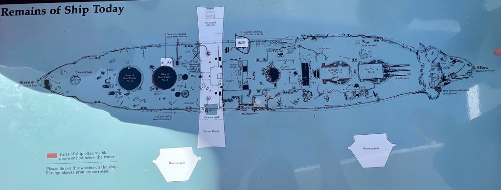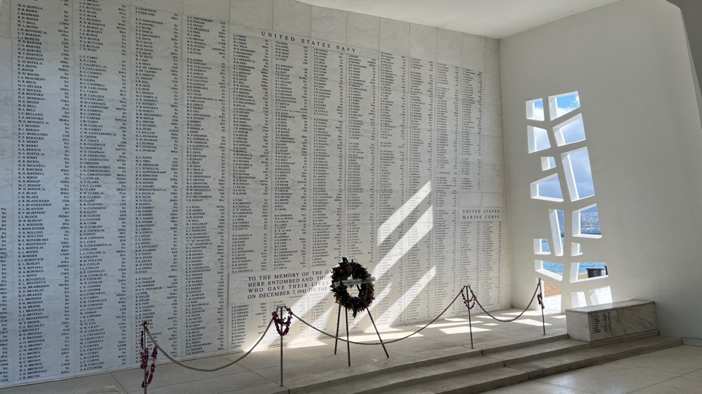It is a short boat ride across a calm harbor to a structure that has been built over the remains of the USS Arizona. Eleven minutes after the attack started, a large bomb landed on her starboard side, penetrating the upper decks before hitting the ship’s magazine, which then exploded. The ship was literally blown to pieces. She caught fire, and with fire suppression and other systems damaged, the parts of the ship that stayed above water burned for three days. Over 1100 of the Arizona’s crew died, about half of the total from the attack. However, her rapid sinking and the resultant fire prevented rescue efforts and trapped over 900 bodies inside. The location became a national cemetery. Surviving sailors, of which one remains aged 102, could choose to have their ashes interred back into the ship. Many lived in torment, unable to find the answer to “why them and not me.” There were 38 sets of brothers in the crew. Divers place each urn being interred in a hole under where gun turret 4 was, and the currents cause the urn to be sucked into the hull; the ship taking back her own.