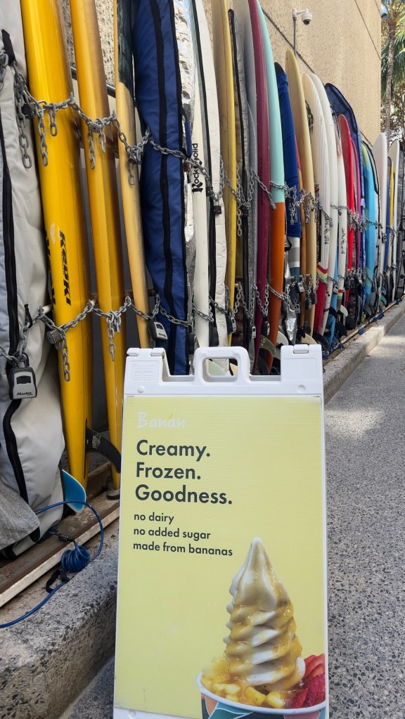 While the high-end hotels dominate the land alongside the beach, there is a alley that provides access to everyone else as the beach is public. Known as Surf Alley, it included both surfboard storage and an ice cream stall doing continuous business (including us!)