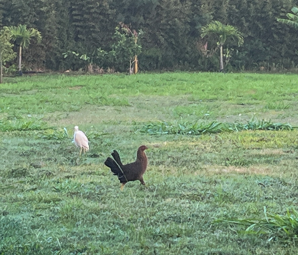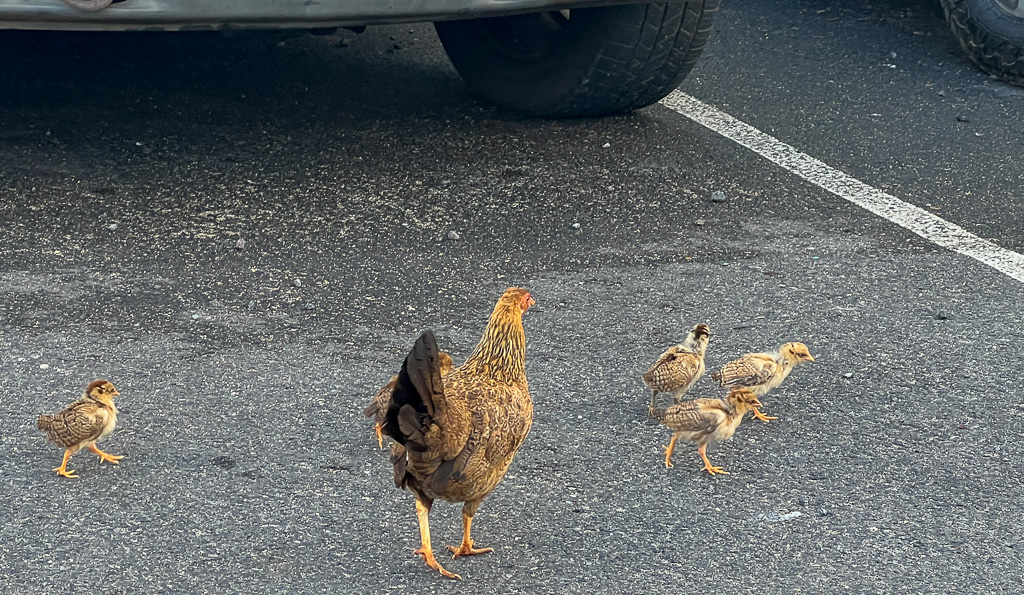 We had to leave the house by 7:30, all packed up, as we were heading to the other side of the island to visit the Kualoa Ranch before going direct to the airport. We swung by Foodland for a quick grab-and-go breakfast. Chicken was in the parking lot rather than on the menu…