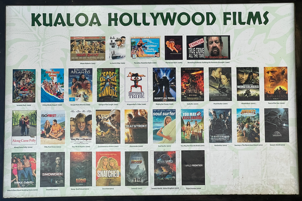 We arrived at Kualoa Ranch with plenty of time to spare for our 9:20am “Jurassic Adventure Tour.” The ranch hosts the filming of many films and TV shows, most notably the Jurassic Parks and Lost, though the film that used the ranch the most was Windtalkers. Below are posters showing all of the films and TV shows filmed on site. Three additional films are in post-production, but the guides could not tell us which ones as they were sworn to secrecy.