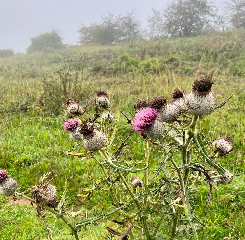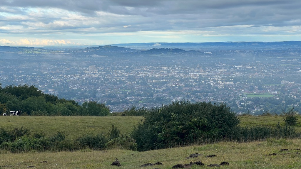 With some challenges getting both to and from the route today, because of where the route is and amplified by it being a Bank Holiday (with reduced bus services like Sunday), we’d considered doing something further south around train stations. Again, the flexibility made a choice more difficult, so we just kept it simple and started close to where we had finished yesterday. We had left the Cotswold Way at the top of a cliff, so driving to that spot wasn’t an option. We found the Cleeve Hill Common Car Park not far from either the cliff or Belas Knap. It is right next to the three large antennas you often see, which worked out to be a great starting point. We prebooked a taxi for a 7am start and Starline Taxis were again very efficient. It took some effort to explain to the driver where we wanted to go but we made it by 7:30.