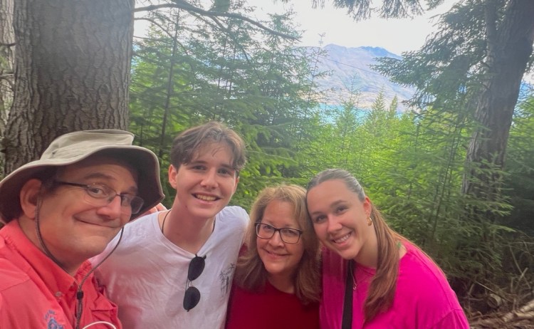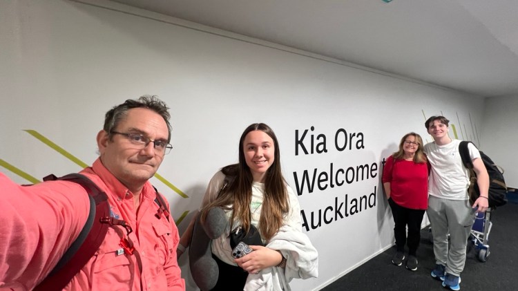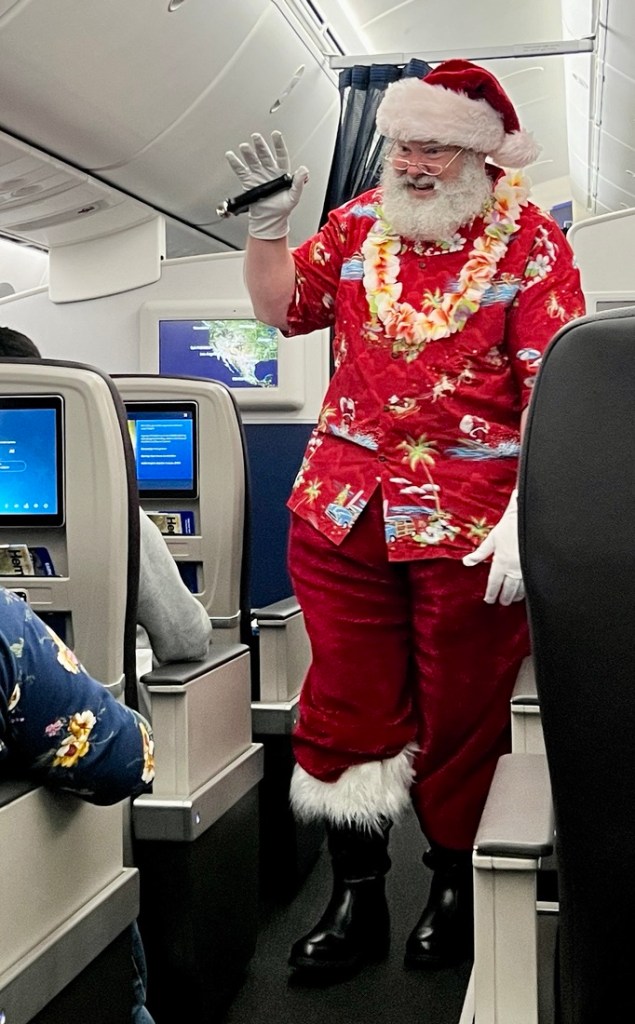 It was a pleasantly uneventful four hours to LAX. I watched Barbie (better than expected!) and The Meg 2 (as bad as expected, and I was expecting very bad) and avoided napping. LAX was a spacious airport, and we were soon on our plane for Auckland, and the vibe was starting to change. Right in front of us was a couple with an eight month old baby, which so reminded us of traveling with our’s when little. No photo, as Samuel would accuse me of being weird! However, Santa also made a stop, with the Polynesian vibes!