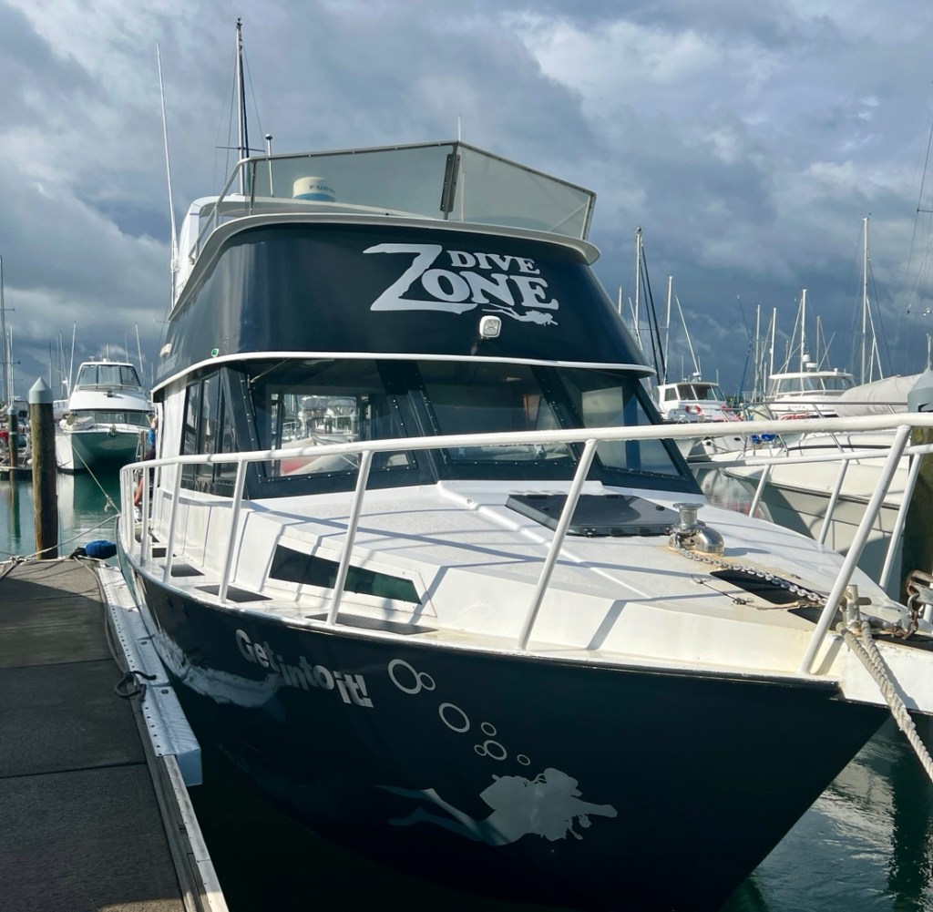 The boat was comfortable for 5 divers, and the air temperature was fine in the 70s, with plenty of shade. It took us about an hour to motor out of the harbor past Mount Maunganui to Motiti Island where we stopped in Waitanaki Bay for our dives.