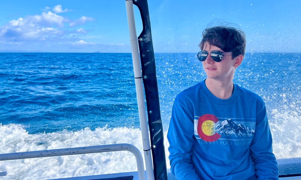 Back on the boat, we packed up and headed back to the harbor. Samuel and I hung out with Ella and Tom on the top deck. We talked about how Tom had only started diving in February that year, coming over to NZ from England when he was one year old, and was now was about Samuel’s age. His ambition was to become a cave diving instructor and he was going to Florida to train in May, then Mexico, and hoped to work for a friend in Malta. He’d been at school with Ella who was a bit older. They could learn to dive as a high school class. They told us a few horror stories of the customers they get, especially American tourists and British immigrants. Also about the local Māori gangs, who are very nice people and buy very expensive dive gear with cash. Tauranga is NZ’s largest port with shipping from South America. At least once a year, a container ship drops a bunch of cocaine in the water just offshore, hoping to avoid the authorities. The smuggler goes and buys a bunch of dive gear, but is usually caught and the police divers retrieve the cocaine. It was a fun chat and I could feel my forehead burning in the sun.