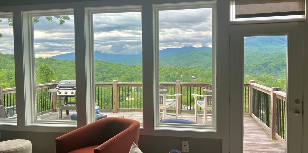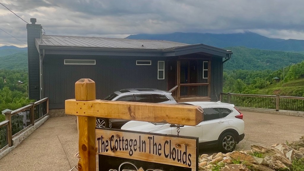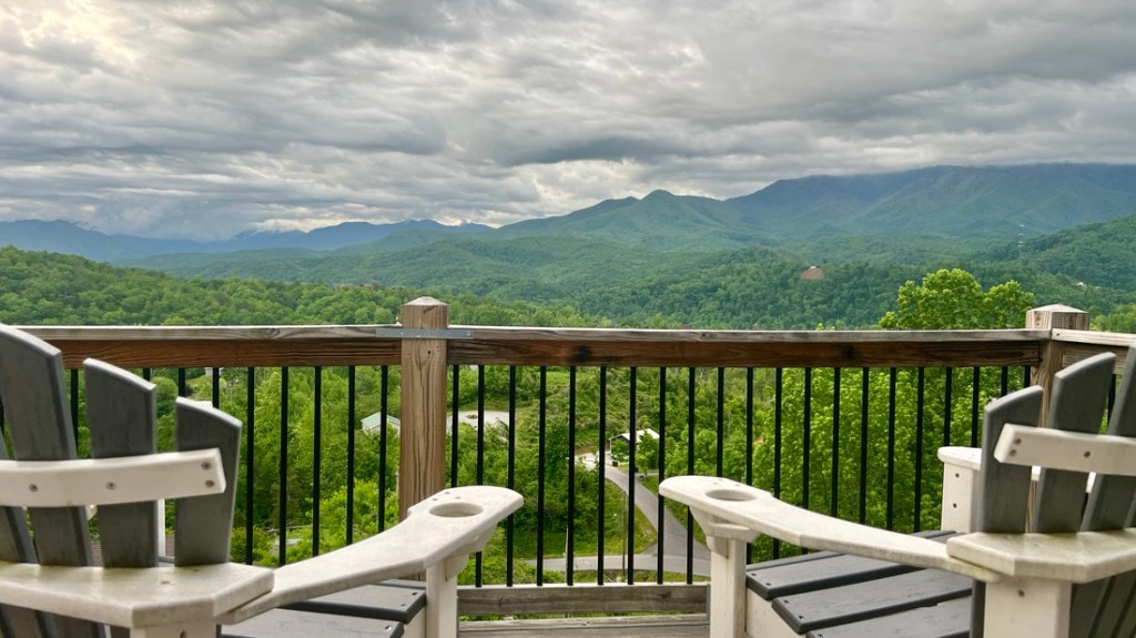 The drive from Pigeon Forge to the cabin above Gatlinburg was uphill all the way, getting very steep at the end. The unfamiliarity of the final hairpin bend in the dark was especially hairy just before arriving! We had to wait until morning to appreciate our view.