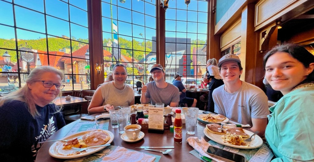 The first mission on Mother’s Day, as per Janet (with Bailey’s guidance) was breakfast at Gatlinburg’s Pancake Pantry. We had seen the long queue outside of it yesterday, so it was a 7am breakfast for us! However, the kids had to do the right thing first…