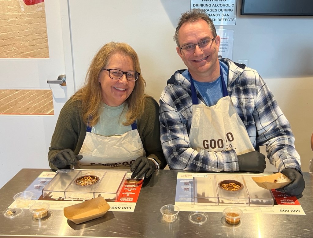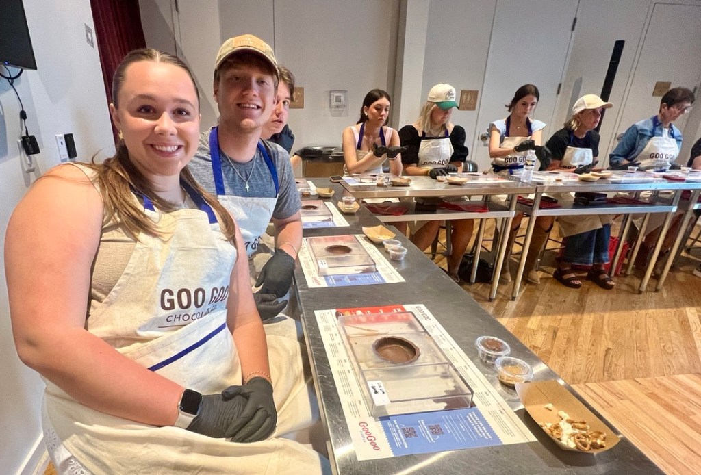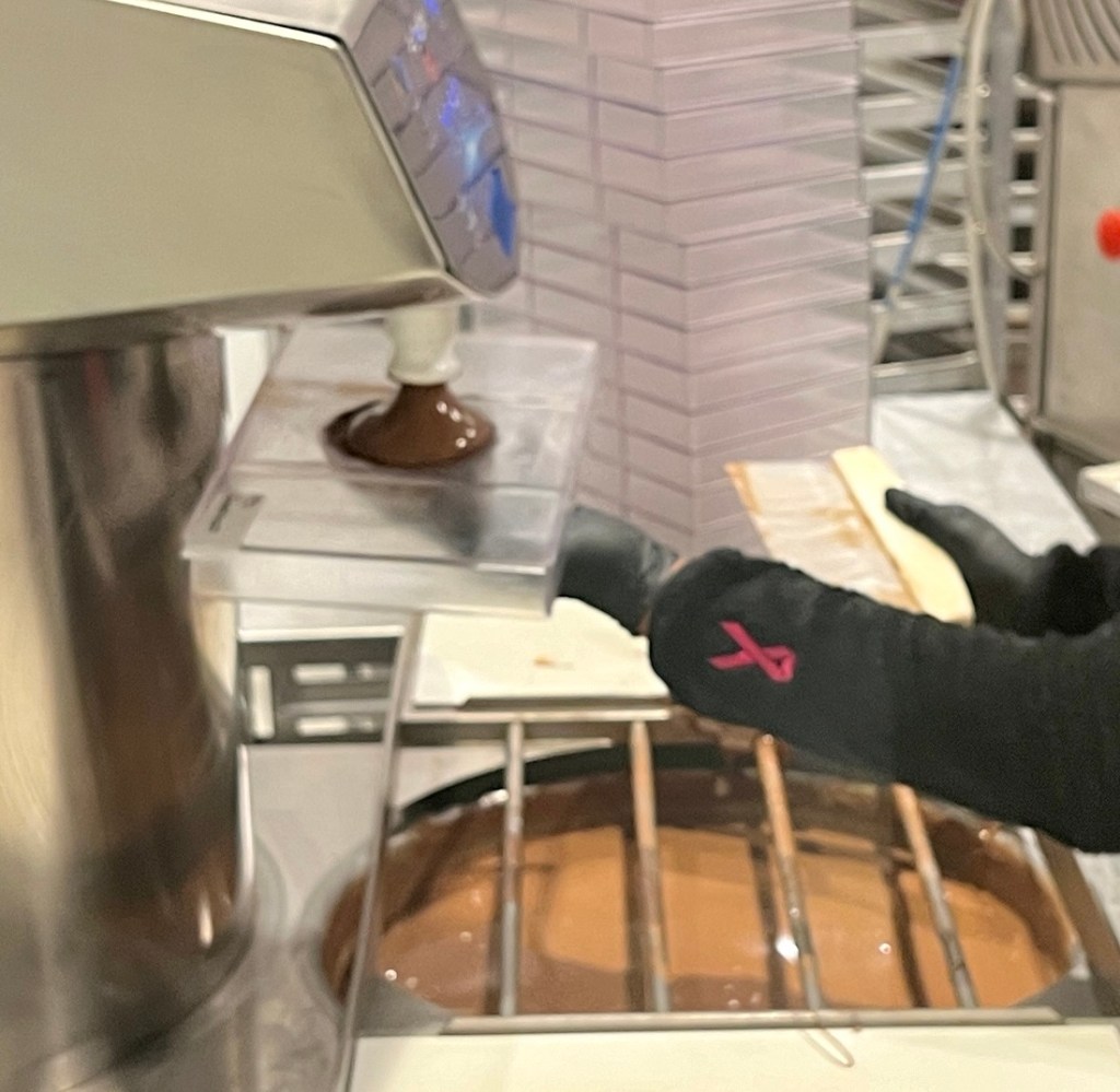 Our classroom.The ingredient selection To place inside the chocolate wheel, we each chose two “wet” and three dry ingredients. Mine were caramel, Nutella, pecans, pretzels, and coconut. Later, when I tasted my finished product, I realized the Nutella flavor was somewhat overwhelming.Bailey was happy!Building our own Goo Goo ClustersThe whole gang.After we had made them, they needed topping off with chocolate. We had named them. This one is Janet’s GooLeah. Chocolate melts at 82 degF, but it helps if it is tempered. The reservoir of chocolate was 120 degF.The top layer of chocolate is my creation called My Sweetness. The chocolate comes out at 85 degF which helps it solidify quicker.The final step of smoothing the bottom. After some rapid cooling, we got our creations back and placed them in their boxBailey was even happier that they gave us several free samples too.We were all pretty happy!