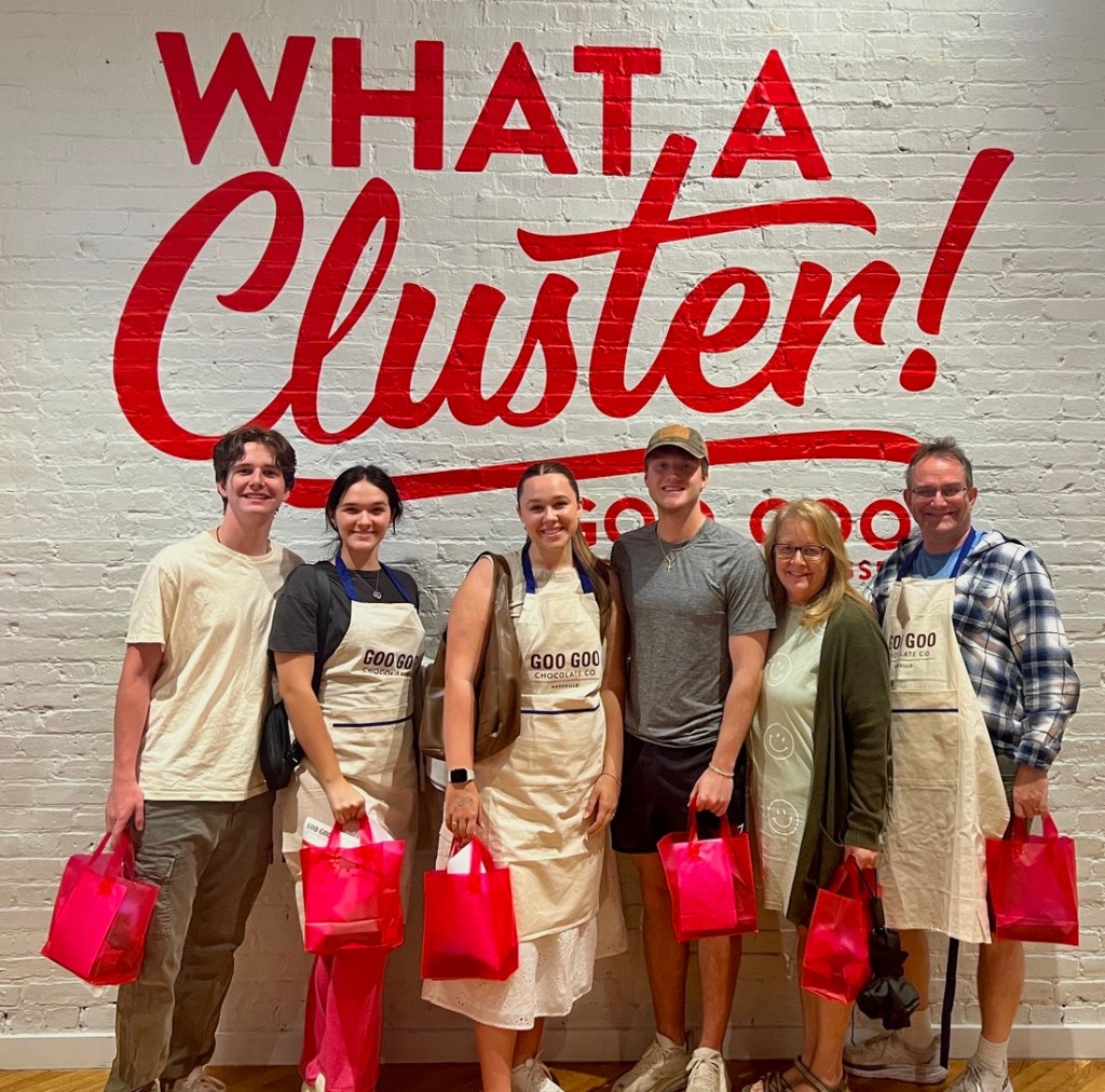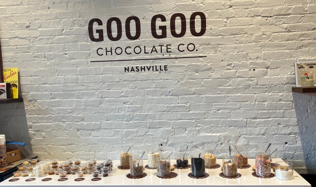 After some fine sausage and cream cheese bars for breakfast courtesy of Kylie and Samuel, it was off for our chocolate making experience with the Goo Goo Chocolate Company. Located just off Broadway and opposite the Johnny Cash museum at its original location, Goo Goo have been making their clusters since 1912. Their claim to fame is that they were the first US Company to combine ingredients into a bar and they remain a Southern tradition, with their main sales outlet stores like Tractor Supply and Hobby Lobby rather than grocery stores. Their main factory is South of town but this central location still makes 50,000 lbs of chocolate a year.