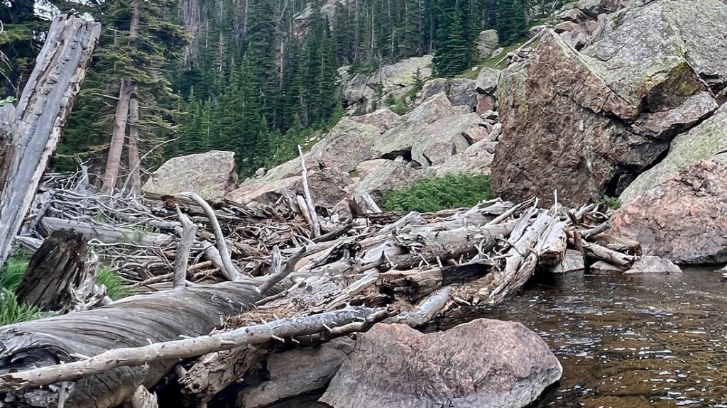 There were also tons of birds and Martin identified the American Dipper aka Water Ouzel (as well as others), and we saw a really cute group of mallards hide in the grasses. We saw marmots a few times and heard pikas and saw moose footprints. We wanted our SLR cameras with big zoom lenses! The off-trail hiking was not as hard as expected. We walked past a fine campsite at the Northeast corner of the lake.